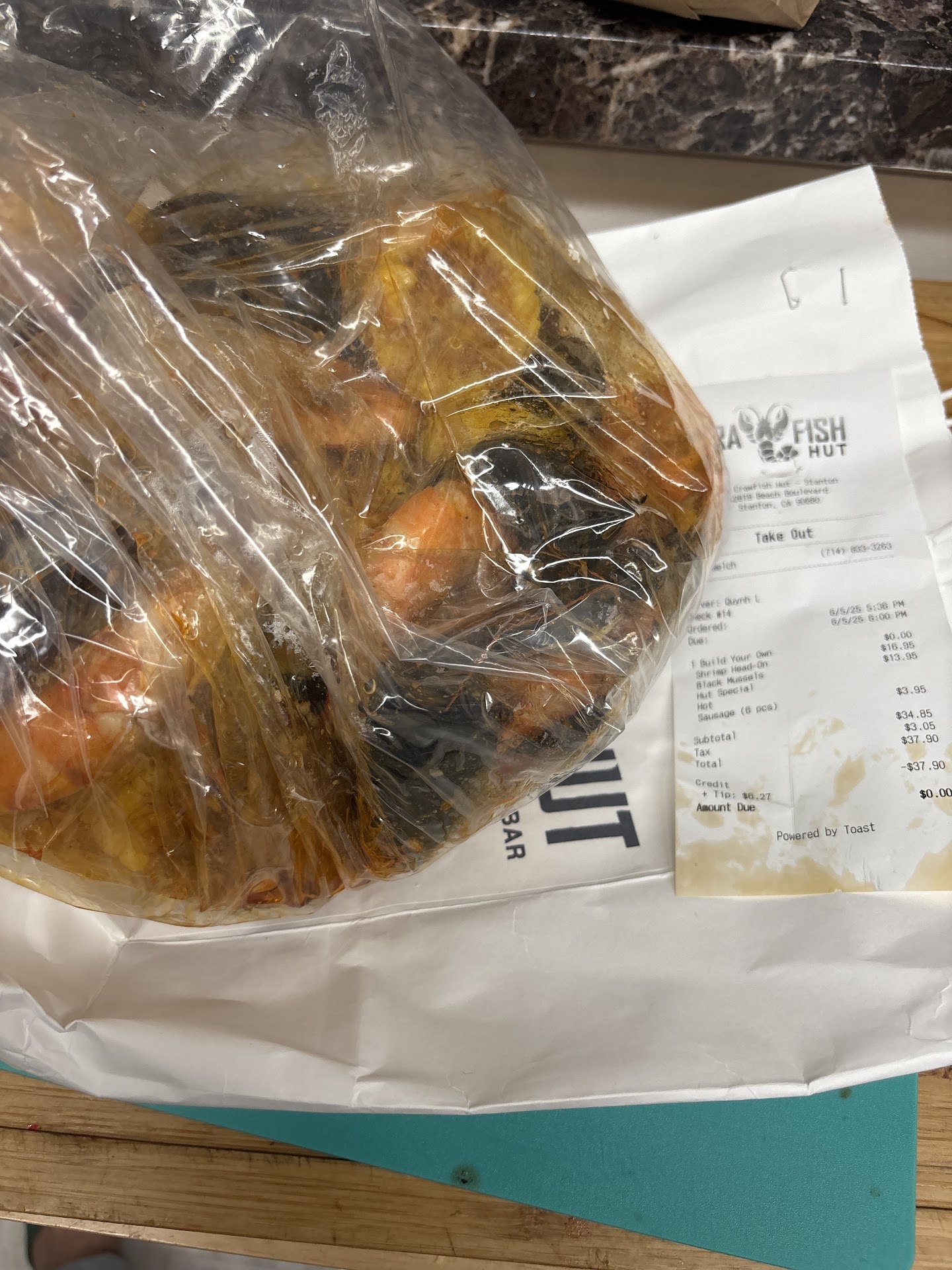 Read moreMake sure you double check the bill because a live crawfish charge will be placed on your bill even though it wasn't mentioned when ordering (or mentioned in the menu) if we wanted live or frozen when asking for combo 1 (1 lb crawfish, 1 lb jumbo shrimp, 1 lb manila clam, corn (3)). Ordered Cajun fries, the fries itself was good, the seasoning was light, could use more seasoning. We ordered combo 1 mild with hut sauce. The sauce is barely there when compared to Boiling Crab/Kickin Crab, you'll have to move aside your food to get to the bottom. Overall the sauce was okay, tasted more like oil then actual flavor. Food texture: Crawfish was fair, and shrimp and clams was good. The size of the shrimp is good as well. Definitely reserve because this place is very busy. Once seated, we waited about 15 minutes for a server, about 15 minutes for fries, and 28 minutes for the rest of the food to arrive. For checkout, they bring the mobile POS to your table ask you to check your bill (they scroll quick), charge your card for you, and holds it until you tip, and sign. I probably would not come back anytime soon. Food and service overall wasn't super memorable. At the very least would try it again in...