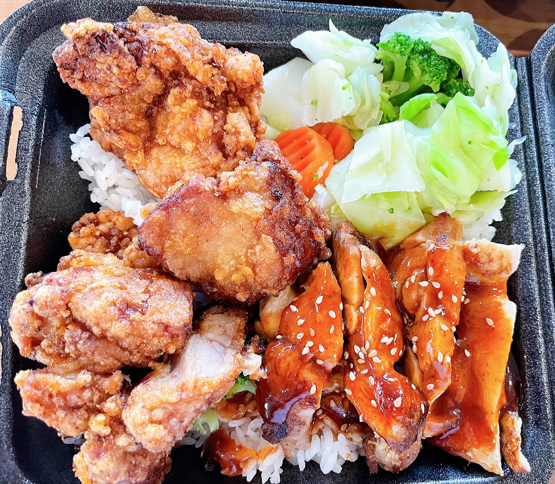 The Combo Bowl came with a thin layer of white rice, some cabbage, broccoli, and sliced carrots. You could choose two types of meat. I went for fried chicken (four pieces) and regular Teriyaki chicken, while my husband chose beef and Teriyaki chicken (Red ginger pack is free of charge.) The taste was definitely different from what I accustomed to in Asia. Letâs just say it wasnât refined, but it was filling and the flavor was okay. (Iâm not going to complain anything else since I used the coupon.)