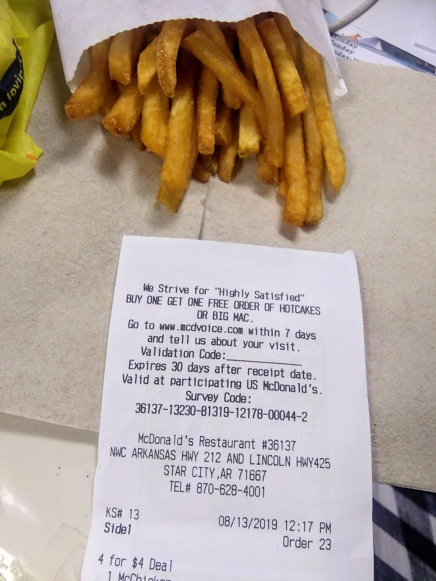 Shut the Star City, AR McDonald's down!!! The one star says it all and I wish I could give them zero stars. The question is when is the last time they changed the cooking oil for the french fries? Or better yet how are the french fries cooked at the Star City, AR McDonald's? Are they cooked in the same way as the nuggets? The fries and nuggets are always terrible (always overcooked and never salted right) and I've had enough. I ordered the four for four chicken sandwich and I'm afraid to know what I put in my body besides the already unhealthy by nature fast food I was craving. The chicken sandwich had the worst after taste like it had been coated in hair spray or some other chemical before and after being cooked. I couldn't pin point the source of the bad taste in the sandwich but I think it was the patty. It may have been the bread, mayo or the lettuce. Everything was terrible like before, I tried them for the second time because I figured it was just a bad batch the first time. The sad part is the McDonald's here is one of the only fast food restaurants in Star City, AR and the only McDonald's there. The pictures say it all, get ready to see nasty. There's bad and there's terrible quality food. The Star City, Arkansas McDonald's is by far the most terrible quality food I have ever...
