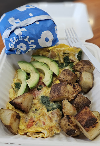 There is an option to build a custom omelet: eggs, bacon, tomatoes, onion, spinach, and fresh avocado slices. Served with potatoes and a bagel of your choice.