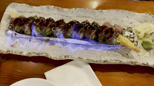 Flaming Beef Roll An absolute showpiece. Served still flaming, the thin slices of beef are seared on the outside and wrapped around a warm, creamy roll with avocado and tempura crunch.
