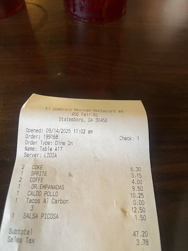 No stranger to this particular restaurant. My husband and I drive 40 minutes to dine. Have never had ANY complaints until yesterday. Ordered Horchata as we always do and requested it slightly warmed as we always do. This time the drink tasted sour (wasn't at all fresh). We made the waitress aware that the drinks tasted sour to which she replied, "Well we're going to have to charge you for them because they are "expensive imports." To which we couldn't help but laugh. Horchata is made with rice, water, vanilla, cinnamon and sugar and unless the owner's abuela in MĂ©xico is making and shipping it to the states, it is not an "expensive import." What she didn't know was that mi esposo es colombiano y his padres y amigos are from Central and South America and that in our lives horchata is a common beverage right up there with agua y cafĂ©. No napkins, over-fried french frĂes w/ketchup packet toppings (covid restrictions but ketchup packets sitting ontop of my fries), flies, shrimp chimichanga hold the shrimp add extra wrapping and a shrimp quesadilla disguised as a taco we will NEVER return. AdiĂłs El Sombrero!! Still left a 20% tip for the lie and poor customer service and get this, the "owner", who visited our table, was...