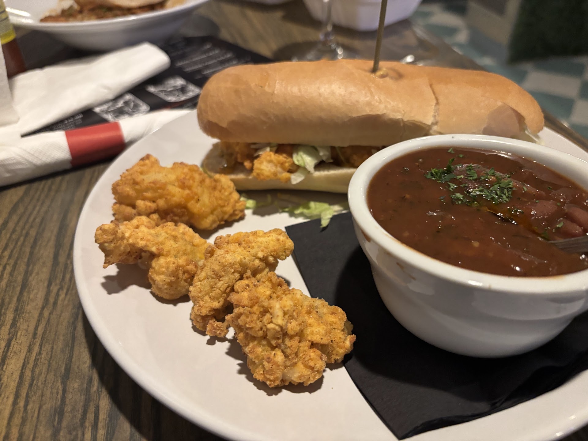 We ordered a couple shrimp poboys and jambalaya pasta and the food was pretty good but the pasta had a few pieces of chicken with BONES in it. Since only a little of it was eaten at the restaurant, my wife didn’t find it until she heated it up the next day. The sweet potato fries I had were super soggy and the sandwiches were a little light on the shrimp for the price. The Jambalaya was spicy (like it should be) and full things but at the same time didn’t have a lot of flavor or even salt.