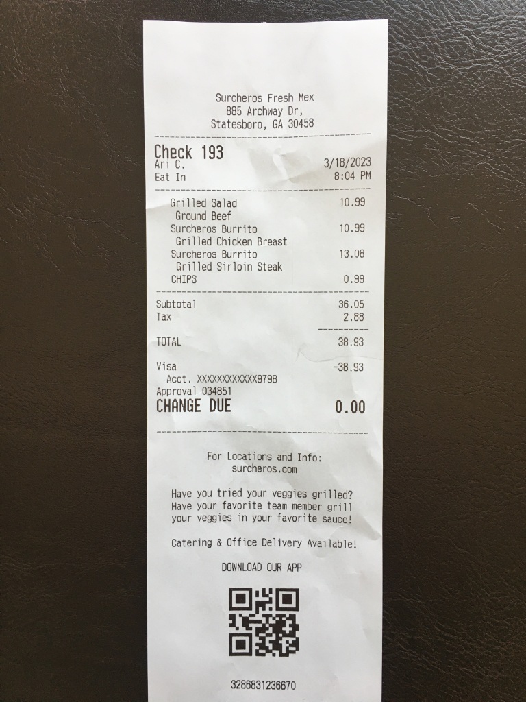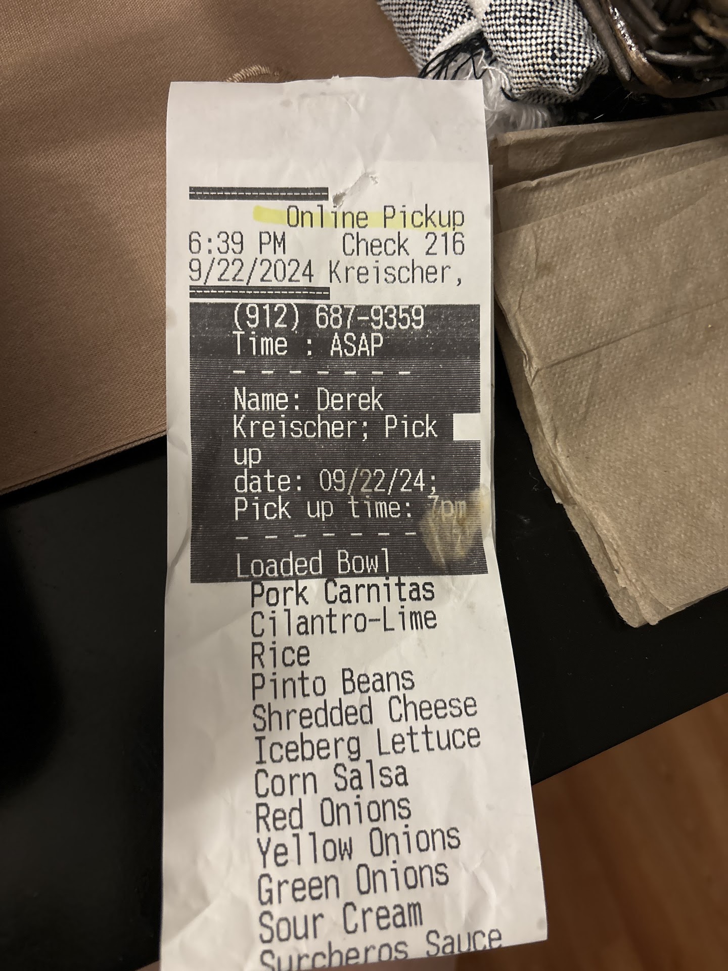 Read moreIts been 1 yrs since my last bad experience here and my wife wanted to order from here for our 28th wedding anniversary 3/18 because my daughter also wanted it. Luke needs to visit this store on a Saturday night. Absolutely horrible management!! nobody in line and yet took almost 25 min to order 2 burritos and a taco salad. The staff was completely LOST and dazed (I would recommend random drug testing)! No rice, steak, lettuce, sour cream was ready and nobody had a clue what they were doing. Johnathan barley put any toppings while garnishing (4 strands of lettuce, 4-5 small chopped onions, 1/2 teaspoon of sour cream...I had to keep telling him to please make it correct, and he looked like he was lost on another planet? I also I had to tell him 3x to please roll up my food so I could check out while I stood at the register forever waiting.. he left my food and started other new orders. Left one burrito burning on the grill the whole time (BURNT) while the other just sat on the counter uncooked and ignored. I said just give it all to me so I could please leave...had my kid in the car waiting on me. Too much confusion tasking instead of stationary job tasks. The register counter was absolutely FILTYHY with hours of smeared dried food stains while the girl just stood there the whole time..she could have been cleaning her station. They forgot to give me my taco salad when checking out. They were all completely zoned out? I will eat elsewhere and return again in another year to see if this place improves or not? Very disappointing, because I truly know the food here is very good when the right staff is working their stations correctly. This visit was an absolute waist of my money for cold soggy food with 1/2 cooked hard rice and "bare minimal" toppings. I threw 1/2 mine in the garbage when I got home. I was sooo upset with the entire...