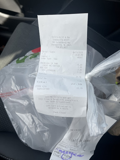 So where to start. We walked in at approximately 4:45 Sunday evening and the restaurant had roughly 10 tables with people at them mostly in the bar area. We were set to the right away from the bar. The waitress(Elizabeth) came over with a severe look of disgust(rbf) on her face like she hated her job. 1 of our party wasn't here yet so we went ahead and ordered our drinks and chips & salsa. We received the drinks in a timely manner, but no chips. The other member of our party(4 people total) arrived and ordered her drink at 4:53. It was received in a timely manner as well, but no chips still so we ask again for the chips. The waitress disappeared for a while then came back to take our order(also without chips again). We all ordered the 3 for me with 3 soups and again a reminder of the chips. At this point 2 of us are out of drink and no offer to refill them. The waitress turns in to Houdini or we turned into ghost and she acted like she couldn't see us for multiple minutes. A member of our group spoke up and said chips as the waitress walked around us and she gave us a dirty look. At 5:32 our soup arrived, still with no chips, and then at 5:36 the food arrives and yes you guessed it NO CHIPS! Oh and I about forgot but 2 of us are still out of drink with no offer to refill! At this point I'm ready to just walk out without eating and go give our money to another restaurant and server that deserves it. I told the manager to take my food back I wasn't even hungry anymore due to the terrible service and atmosphere thus far. One of the meals was supposed to come with broccoli and it didn't come so we had to flag down another waiter to get it for us since our waitress wasn't around. The Statesville Chili's has become pathetic and needs better management and service providers! We won't be back and I advise everyone else to look elsewhere for meal needs!!