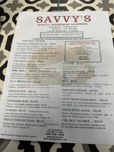 Read moreEverything about this place is 5 Stars. We drove just over an hour to check out the antique stores in Statham and the shop owner recommended Savvy Cakes and Legendary Sandwiches. They werenât wrong. Hubs had the mushroom swiss burger and I had the double cheeseburger with LTO and pimento cheese. Pimento cheese is one of my favorite things but so many commercial places do it wrong by making it sweet or the texture is off. This place made it exactly perfect. It was tangy, zesty, creamy, and complemented the hand pattied burger perfectly. My husband, who is usually disappointed by restaurant burgers, especially mushroom swiss style, took one bite and said, âyesâŚâ That told me everything I needed to know. For sides he had the fresh cut fries and I had the onion rings. Both were absolutely delicious. For dessert we shared the gooey peanut butter bar and just when we thought the experience here couldnât be better, that soft, sweet, gooey cake took it to the next level. We highly recommend this place to anyone passing through the Winder/Athens, Georgia area. You wonât be sorry. The staff is friendly and that alone would have made this a good place but when you add the solid cooking and baking skills, affordability, and the adorable atmosphere, it makes it an all around fantastic place to visit and a place worth...