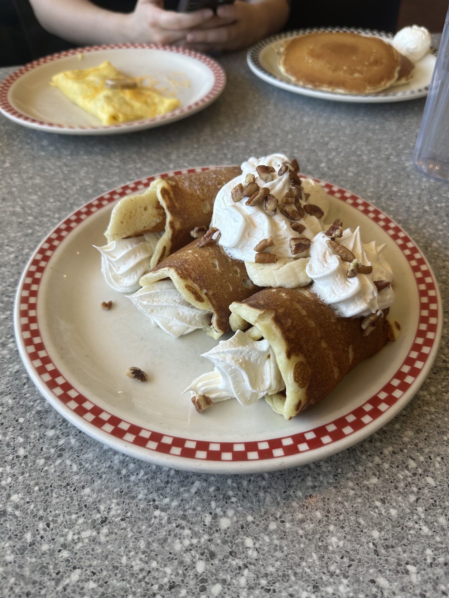 We ordered the pancake roll-ups, and wow, what a treat! The dish came with three fluffy pancake roll-ups, topped with a generous dollop of whipped cream, crunchy nuts, and perfectly ripe bananas. It was almost too beautiful to eat—almost! The flavors and textures blended together so well, making every bite absolutely delightful. I even took a photo before diving in because it looked that good.