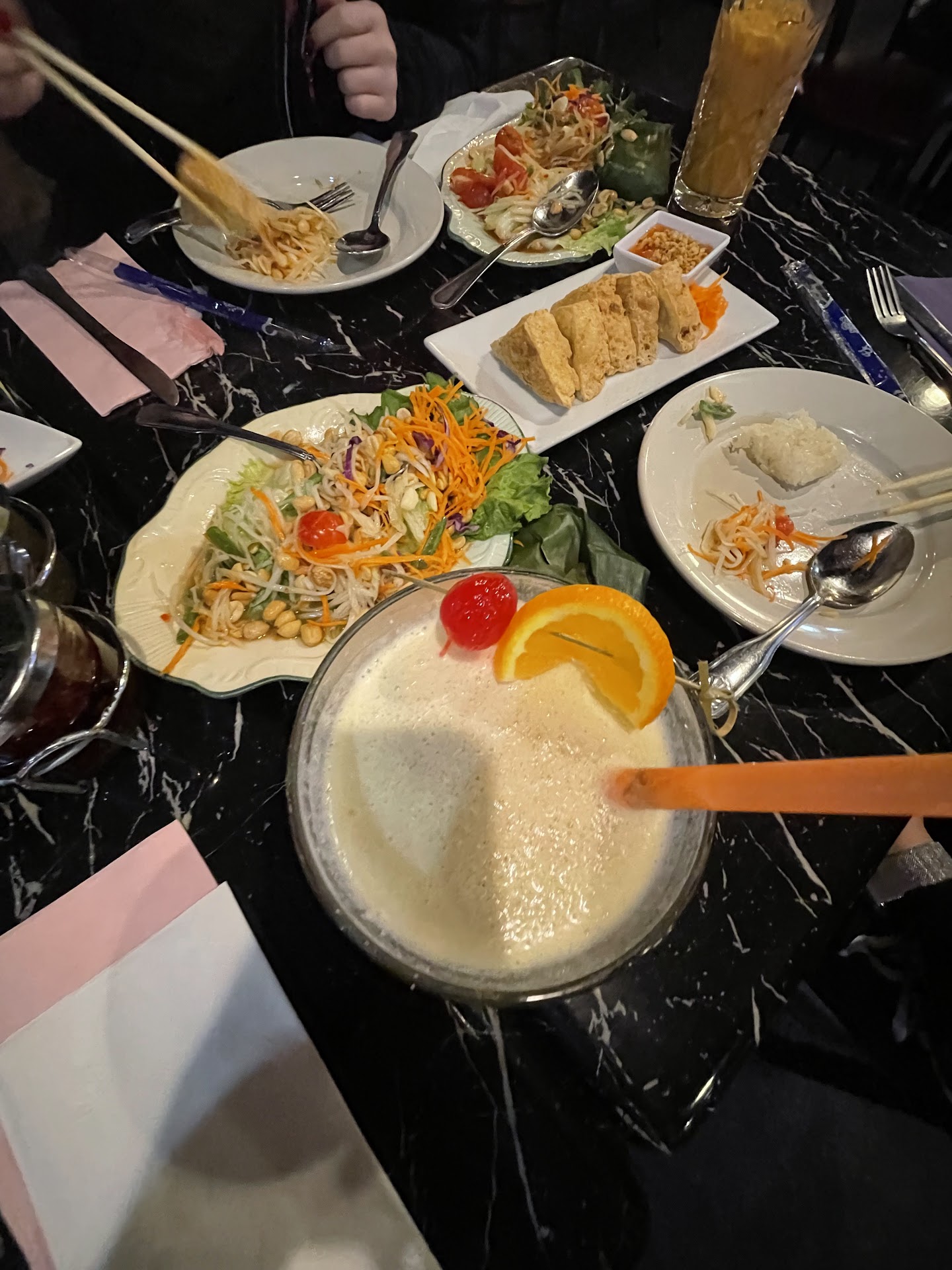Read moreWe are at this restaurant for dinner while visiting Virginia for seeing the fall colors. The restaurant is located in downtown. There is sufficient parking facility for 10 cars at the very least. There are ample number of vegetarian as well as vegan options for the offering. We ordered the stir fried ginger with shiitake mushrooms and veggies, along with vegetarian mussaman curry. The mussaman curry was decent and had a mildly sweet flavor. The stir fried ginger was a bit on the sweeter side for me with an overpowering flavor of dried ginger powder rather than of fresh ginger. We also ordered a couple of drinks. I only got my third choice of drinks since they had ran out of some of the alcohol which was needed for my first two choices. I finally settled on a drink named the Bangkok sunset, where the taste was primarily of the orange juice rather than a balance of the alcohol tasty and the fruit juice ( which is expected of a good cocktail). The second drink was named blue kamikaze. It was a decent drink as well. The waiting staff were polite and helpful. The waiting time for the food was very less as well. Overall it was a...