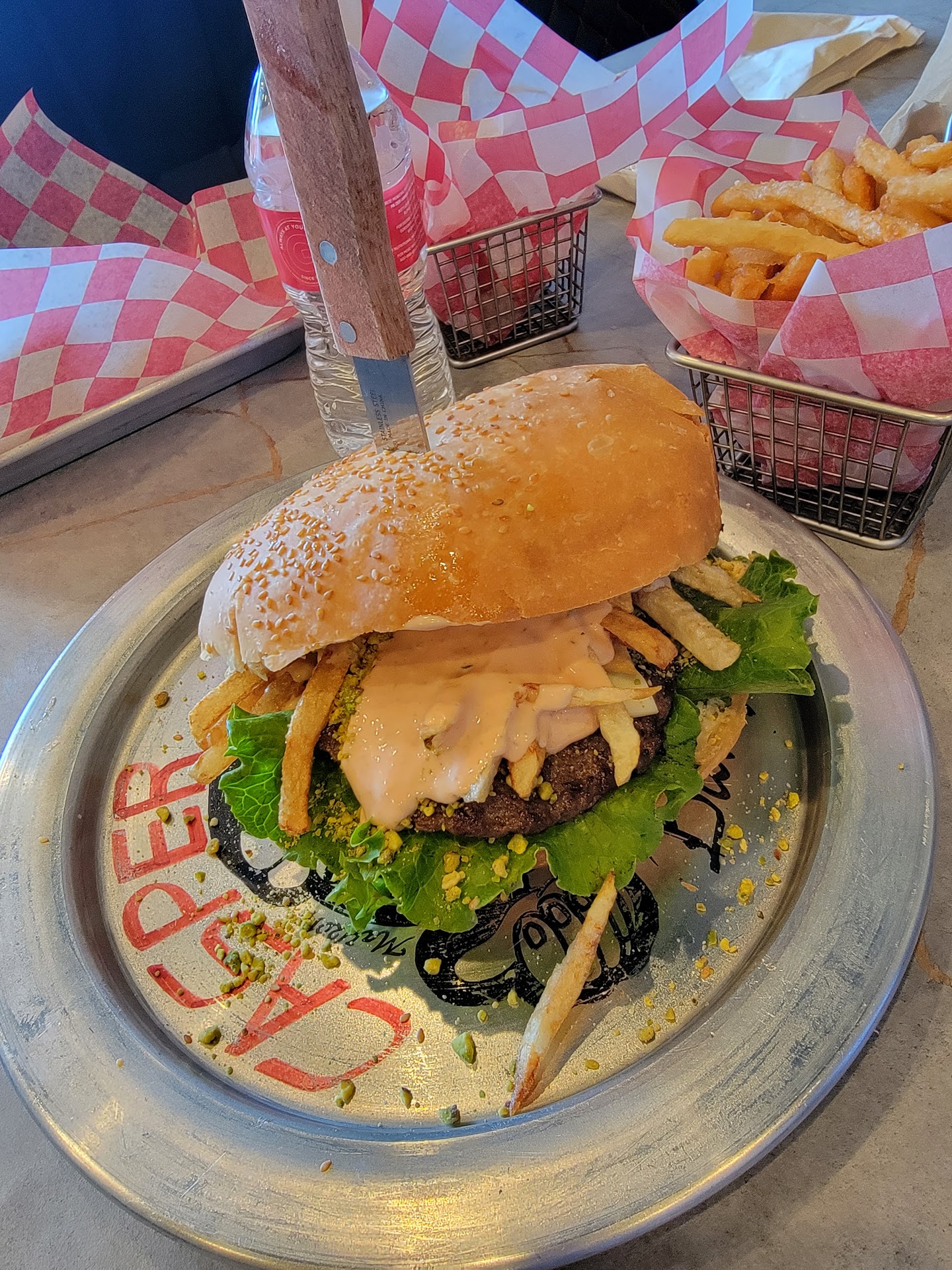 One of the guys got this 15 dollar burger and man we all told him it was a bit steep but dang this burger was huge. It could probably feed 4 men if they had a protein shake to go with it. Burger was crazy multiple patties a chicken breast and probably 2 sides of fries between two toasted buns. That looked great.