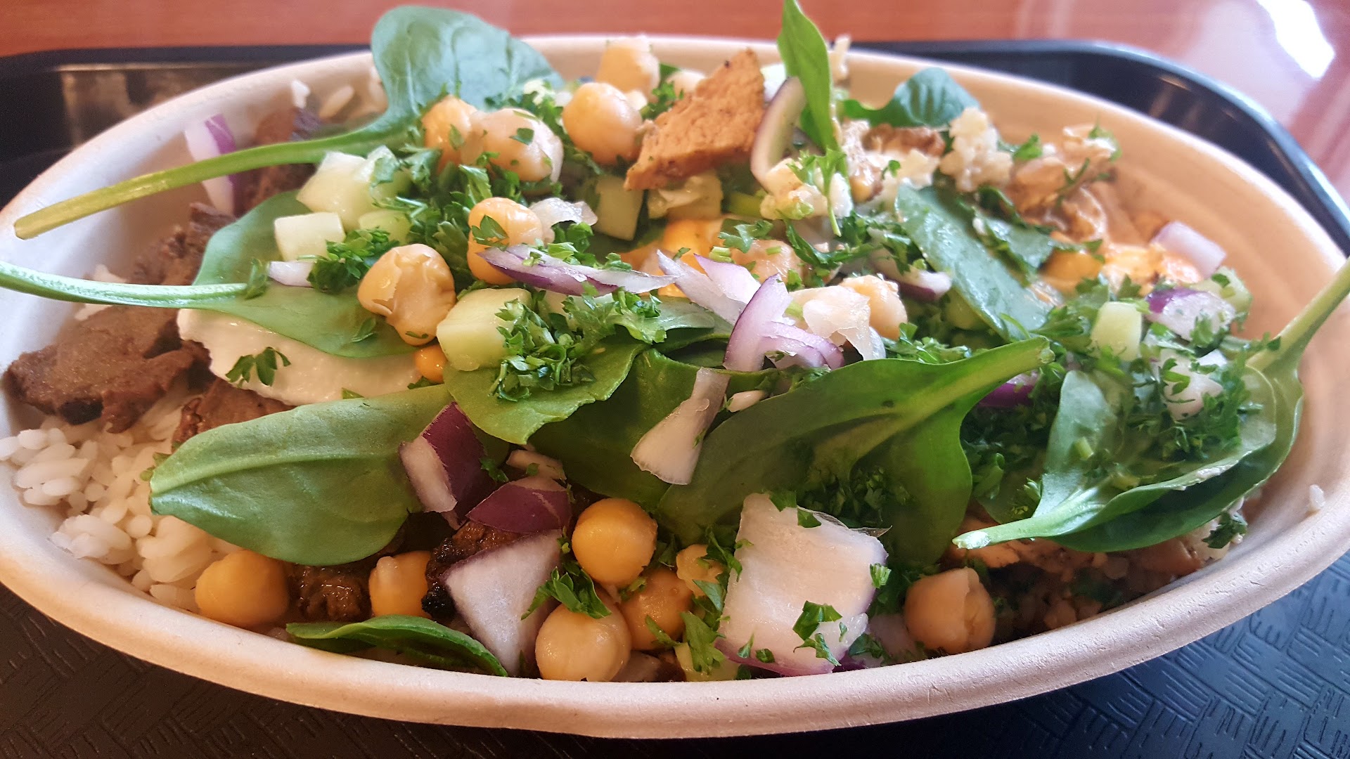 Read moreLove this place been coming since it opened. I hate to complain because this place stays busy but recently some of the younger lady's that work here been playing me as of late. I forgot to order hummus because they were busy and moved straight to veggies so after ordering veggies I asked for hummus. The lady making my food said sure thing. The girl behind the counter (who did not make my bowl) saw the hummus on top and asked how many add ons. The lady who did make my food said none. And specifically explained that I did hummus after veggies and said there were none. This young lady for whatever reason felt she knew better than the girl who made my bowl and still charged me for an add on that I did not get. After I paid she immediately crumpled the receipt and went to throw it away until I asked her for it to confirm she charged me even though she was told I didn't add on. She looked at the crumpled receipt and gave it to me before hurrying away. It's only 50 cents and I love this business so I don't mind the measly 50 cents and I definitely don't want to slow the line down when they are busy to argue over the add on so here I am with a review. Wished her a bless day as she always does to me and others on the way out but ignoring your coworker who made the bowl and up charging me really pissed a...