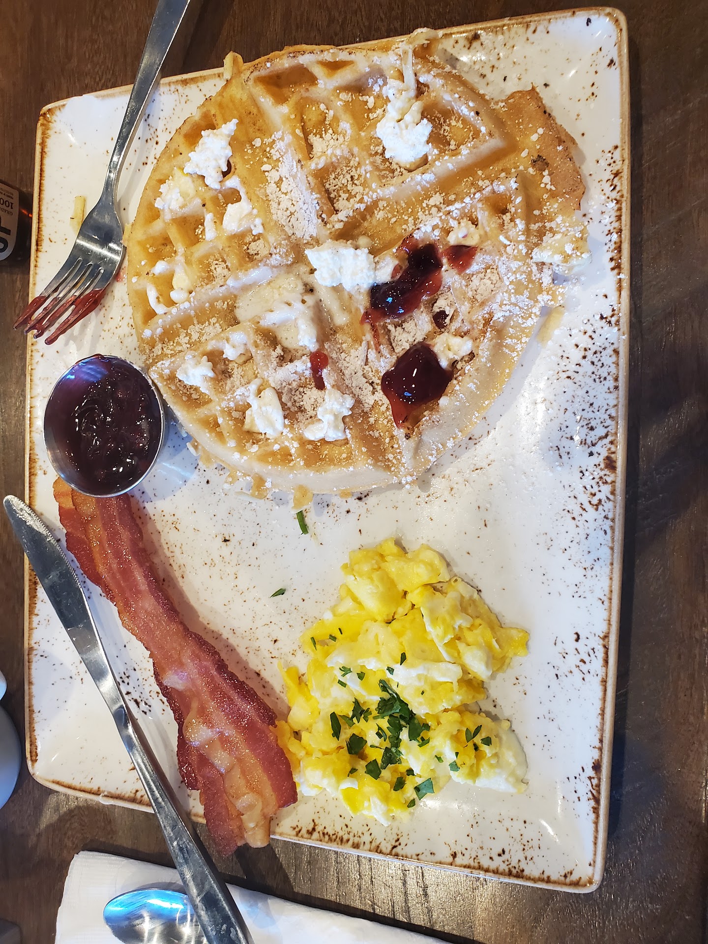 My wife ordered the lemon ricotta pancakes. They gave her two huge multigrain buttermilk pancakes and warm maple syrup. The ricotta cheese was a sweet compliment to the delicious pancakes!