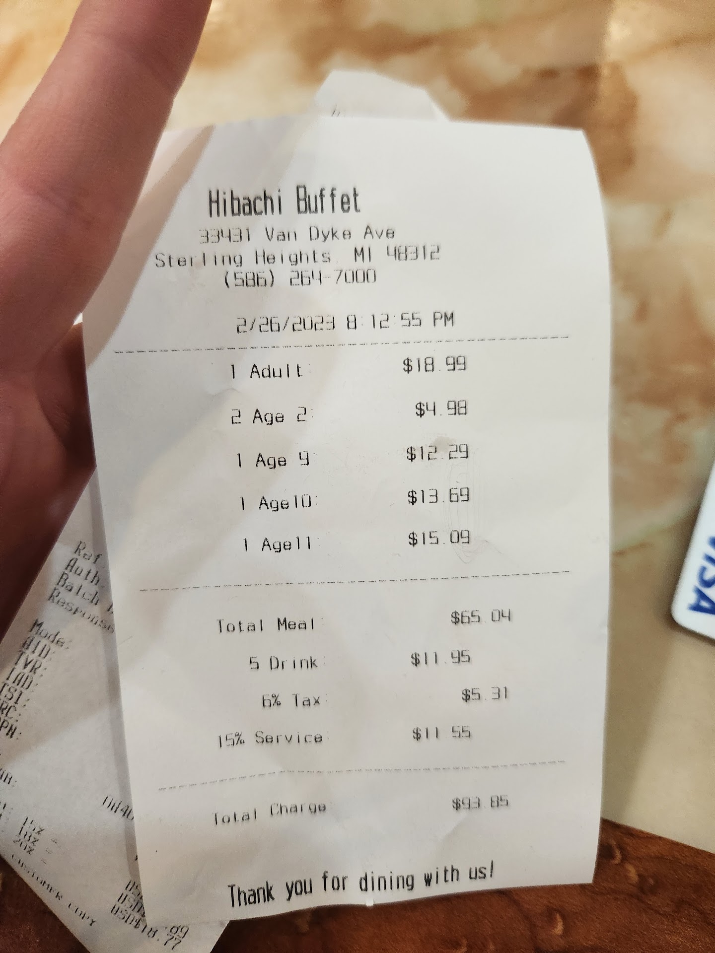 My family and I were invited here for a birthday dinner for our cousin. Myself, boyfriend and our 5 children were the first to arrive. Upon arrival, the hostess said " how many" I told her what we were here for ( the karaoke room), and proceeded to say, " you didn't pay any money"...I politely said that we were guests and I know nothing about that, so we were instructed to wait til the rest of the party got there.the bathrooms were DISGUSTING. No paper towels, all trash cans over flowing , including the little trash cans in the stall over flowing with feminine products and tissue. (I told the hostess and she said ok, but even when we left they never cleaned it) Within 10 minutes everyone showed up, and there was a different group of people in the room we were supposed to have. We were (all 20 of us) were put in regular seating amongst other customers and told we will eat here until the room became available and then we would be moved. ( that never happened) . The staff was so unorganized it was mind blowing. The hostess came around to gather everyone's drink orders which was a challenge in itself. We waited 15 mins for drinks, and while waiting another lady came around and asked everyone what drinks they wanted AGAIN. We simply said, we've already placed our order, she rolled her eyes went to another member of our group asked them the same question and they told her we already placed our drink order and she walked off. At this point, every one is eating. The food wasn't bad. But wasn't great. Nobody came around to pick up our dirty plates, some of us took our own dirty plates and found the cart for dirty dishes and put them in there to make room on the tables we were eating at. Furthermore, the hostess came back around and started asking how we were splitting the bill. ( not how is everything, not to pick up plates, not asking if we wanted refills) Everyone told her how the bill was going to split. A few mins later, another lady came around asking how we were paying. At this point I'm annoyed. I said " since the moment we walked thru the door yall have been asking about money, you haven't picked up a single plate or asked about refills, we've already done all of this with the other lady" she laughed and walked away. (Leaving all the dirty dishes of 20 people still on the table that were being stacked up around us) the hostess lady then comes back with the bills for us. During this time, my boyfriend is holding our daughter while the lady has her knee on his chair preventing him from sitting down, which lasted a few mins. Our cousin paid for 2 adults, 2 drinks and his bill was $58 and some change, while 2 other cousins had the same thing, but they had a different price on their bill. My bill was 1 adult ( my boyfriend didn't eat bc he wasn't happy with how things were), and 5 children. Two 2 year Olds, a 9, 10 and 11 year old, 5 drinks. My bill was $100. They charged the kids by AGE. $12 and some change for the 9yo, $13 and some change for the 10yo, and $15 and some change for the 11yo. And $2 and some change per 2yo. They put on a service fee of 15% for gratuity, but there was no service provided since I already explained that part prior. I paid my bill, but didn't tip bc they try to make you double tip and service was horrendous. After we paid, we went to leave and there was about 30 people standing at the exit preventing us from leaving ( fire hazard). We had to push ourselves thru just to leave this establishment. This place is a SCAM. No set pricing, no hospitality, no organization. We will never be back. Other members of our group said the same thing. Overall. Bad experience. Do...