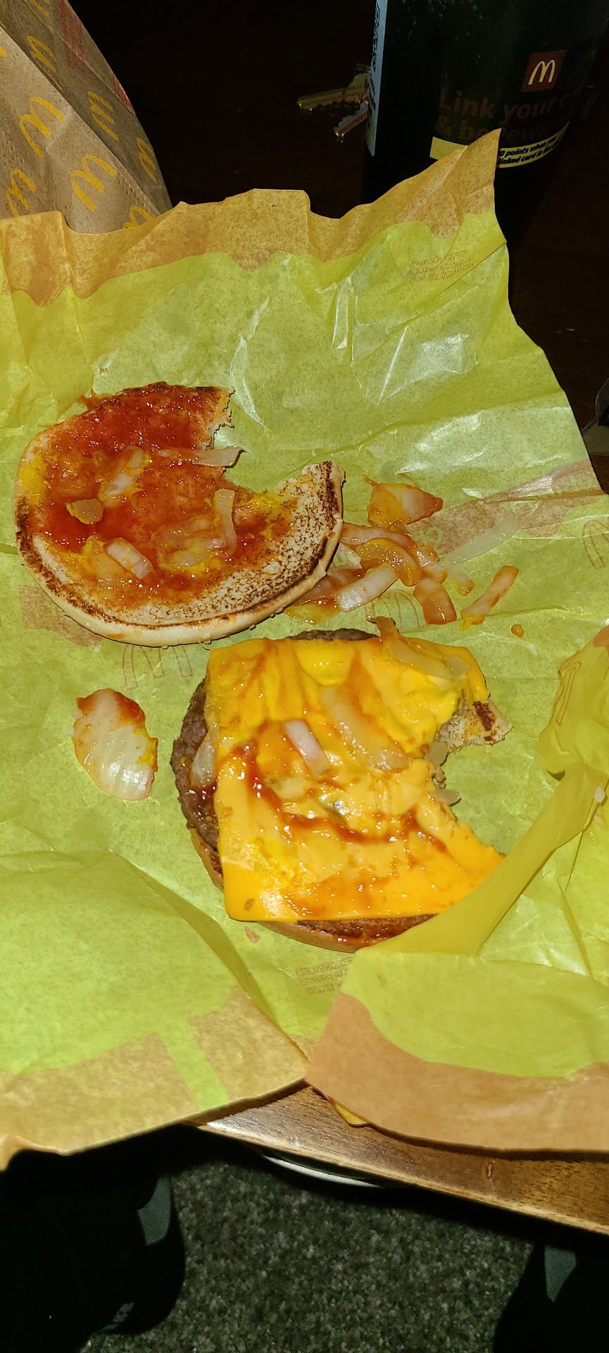 The large coke as always was refreshing and hit the spot. The French fries were hot, fresh, and delicious. However, the cheeseburgers were horrible. The bun was stale, hard, and cold. Along with both patties they were room temperature at best. I ordered them without pickle and mustard with extra onion and ketchup. So I know it hadn't been sitting under heat lamps as it had to made fresh. If that is fresh I am appalled. Atmosphere gave a 3 star because it was a drive-thru order. I wouldn't even give them to my dog.