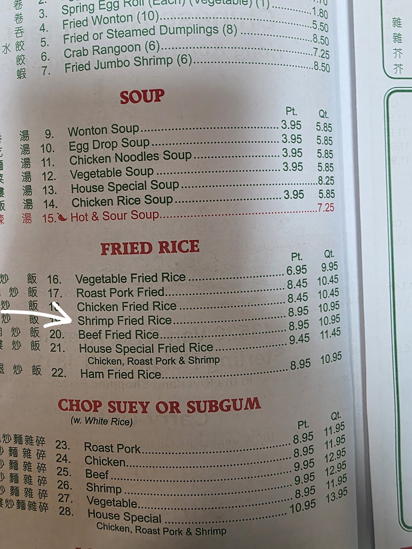 The woman at the counter asked me what I wanted. I told her just shrimp Fried Rice. Please, she said, that's it.I told her yes, she said what size I said small. And that's when she told me $10.95, now let me tell you I was a little shocked. I'm like, does it come with an egg roll, lol I picked up the menu to see if I wanted to get a combo instead, assuming it would only be a couple bucks more and sure enough, there's shrimp fried rice listed a la carte as $8.95 i pointed to the menu and told her this is what I want. Shrimp, fried rice, small for $8.95 she had the audacity to go back-and-forth with me. Looking for another menu, when the menus were brand new and all stacked up.And everyone that I looked had the same price. And then hubby comes from out of the back kitchen, telling me that "No today is upday!" I said "whatintheactualshit is Upday?" As soon as I took a picture of the menu and told her I'm going to write a review. She said, "okay, okay I give you 8.95" as listed. I said "no no kiki" and walked out.