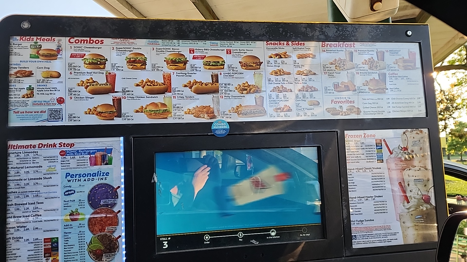 HORROR SHOW! My family and I have never been to a Sonic. So we were really excited to try a Drive-In restaurant experience. I ordered online, we had 4 varied combos each with either a slushy, lemonade or shake. The online order experience for the huge variety was awesome, the order process went without a hitch. I set a pickup time of 845pm and we made our way to the Sonic from our hotel and arrived on time. The online Sonic page on my phone sensed we had arrived and asked which stall we were in? I punched in #7 and we parked, and my name and order came up on the stall screen and indicated it was on its way and that someone would bring it out shortly. It all seemed to go according to plan. We were very excited and quite impressed with the order and pickup experience and the technology.