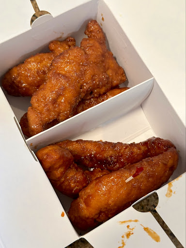 Ā Ā Ā Read moreThe host Dillon (I hope Iām spelling this right, forgive me) was so great and warm he greeted me as I entered the store. I came to pick up my online order, to which he made adjustments happily due to the need to add more items for me. This is by far the best location they have. I was given a fresh ātasterā as they came out of the fryer and sauced, which I cannot express how amazing and thoughtful this was, while I waited for my pickup order. Everything was great, though the chicken traveled better than the mandu (of course I knew I would have some bit of sog, but much less than anticipated!). I must say the crisp on the wings really baffled me with how juicy they were, such perfection in the cooking and flavoring/saucing. I also must give Dillon his due kudos for his generous hospitality and just overall great demeanor with customers, staff and Iām sure heās personally a great person to hang with! I will be coming in to try the AYCE menu on weekends, details in the picture...