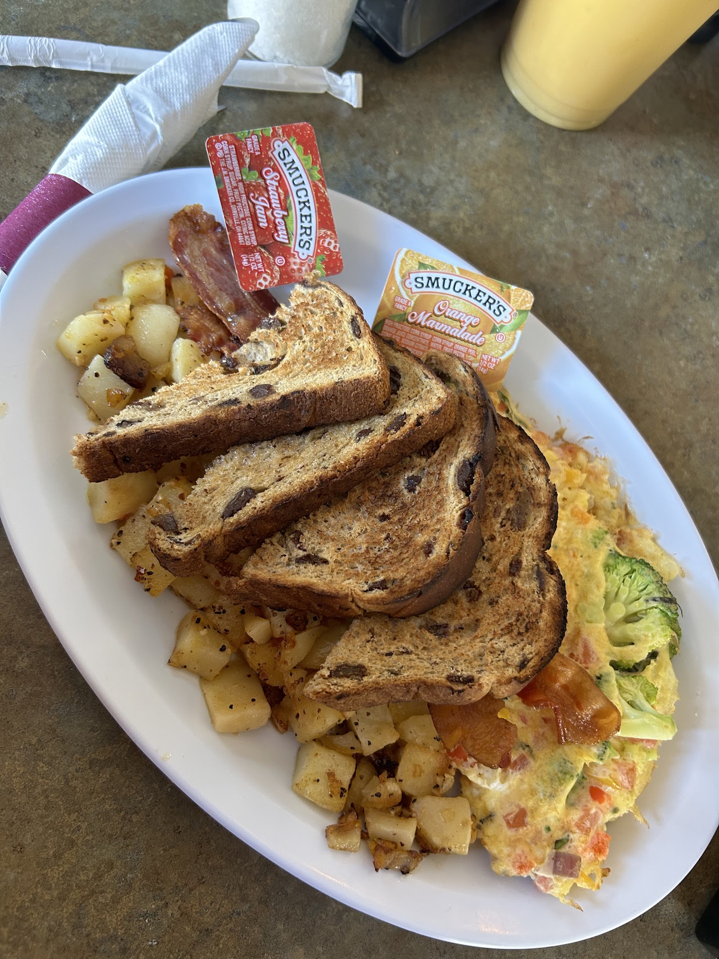 The food .. I hate ordering eggs anywhere because they're frequently overcooked. There wasn't a burned egg on the plate. The bacon was cooked perfectly too..see the picture for proper bacon stiffness.