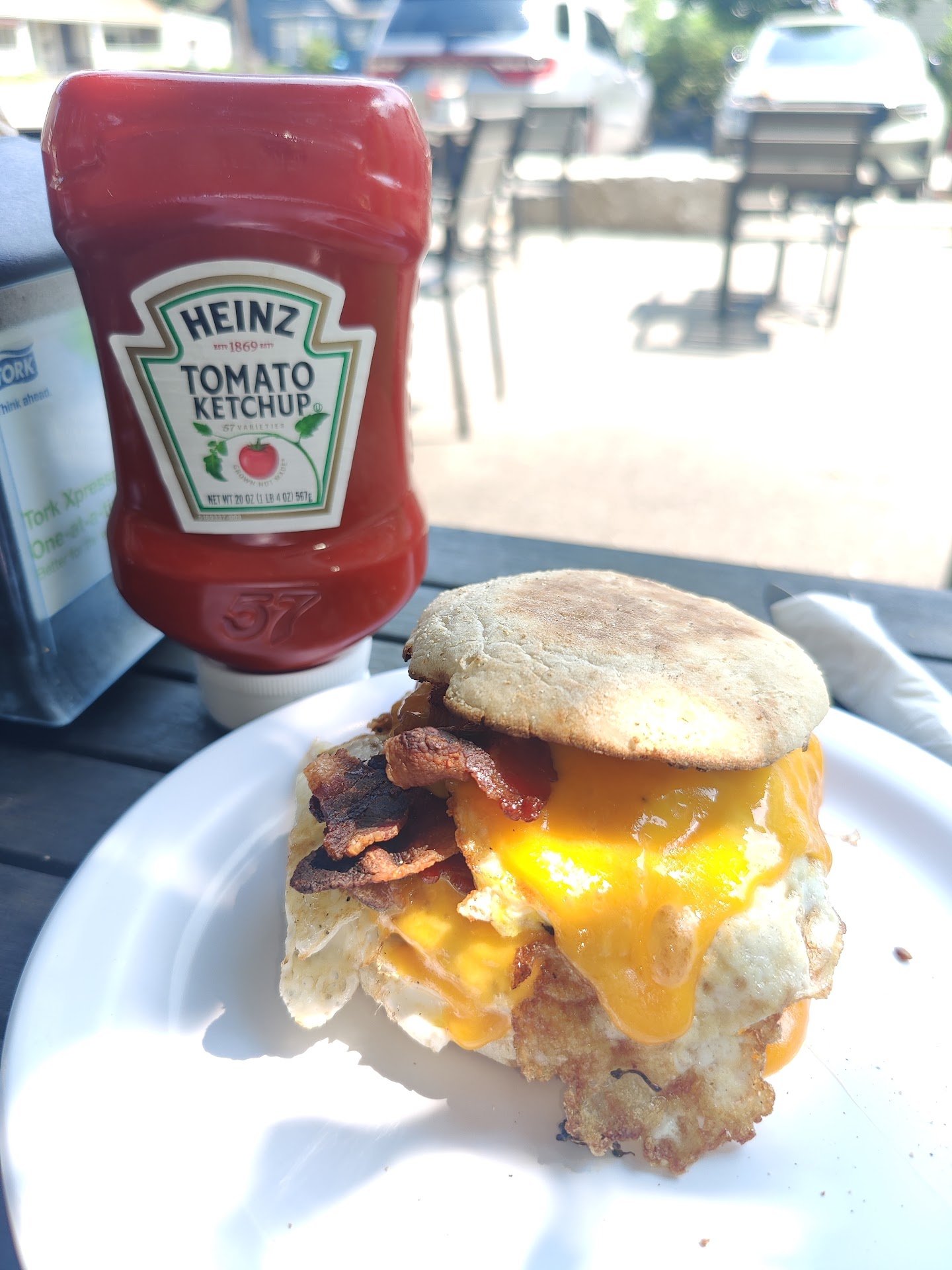 $8 The Hungry Man (replaced ham with sausage). Egg, sausage, egg, cheese,bacon, egg, cheese, bacon.. that's literally what I'm looking at. Oh, and an English muffin too, though there are other bread options. You can tell those are fresh cracked from the shell eggs. It's real cheese too, I can almost taste the name of the cow who gave the milk to make this cheese. I would probably ask for another piece of meat in the future, unless you want the egg to really be the central flavor. Lightly toasted bun. Added some jam from their selection. Delish.