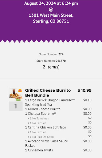 We usually use the kiosk to do our orders ourselves. We were last there on August 24, 2024, at 6:24 p.m. as you can see in the pic attached, my husband ordered the grilled cheese burrito bell bundle. His chalupa Supreme was to have no tomatoes and no Lettuce, the cantina chicken soft taco was to have no Lettuce and no Pico de Gallo. When we received our order, both of the items had everything on them he asked to be removed, and he was missing his cinnamon twists. When I went up to the counter to get it corrected the lady working, (I would give you a name if I had one, but no one I dealt with had name badges on) kept walking by, she went to the back where the food is prepared then finally came to me and asked in a very snotty tone, "what do you need?" I told her what the problem was and she started arguing with me and telling me that the items he requested to be removed aren't on the items we ordered then stated that there shouldn't be an issue with them. I then opened both packages to show her the items and prove to her that the Lettuce, tomato, and Pico de Gallo were, in fact, on there. She was super snotty and said well....I can't accept those back. She stared at me for a bit then I asked if we could please get them corrected and also get our cinnamon twists. She said in a very snotty tone, well...I suppose we could remake them, then she walked off over towards the drive thru. A minute or so later, she went to the food prep area and very snotty told the 2 ladies there that I needed some things remade. She couldn't remember what I needed so I told them, I needed 1 chalupa supreme with no tomato and no Lettuce, then 1 cantina chicken soft taco with no Lettuce and no Pico do gallo, and an order of cinnamon twists. The lady that helped me at the counter walked off back over to the drive thru, then came back over to the food prep area, quietly said something to the ladies making our items, then they all looked up at me smirking. Shortly after that, one of the ladies making the order held up a bunch of purple cabbage while shaking her hand back and forth she rudely and loudly shouted, "Do you want this?" I told her "yes, please." They stuffed both items in a bag and brought it up to the counter and dropped the bag on the counter. I looked at her and said thank you, but we still need our cinnamon twists. She grabbed a bag and gave it to me. I then left the counter. There was never a sorry we messed up, or sorry for the mix-up, just the employees being rude and snarky. Great customer service you have going on in this establishment...while this is a small issue to me, to your business it is not. If this is the way your employees are treating customers, it won't be long before the doors close again to this...