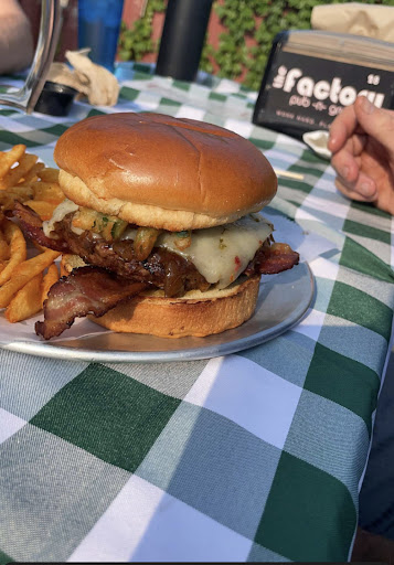 Read moreGreat food! Went on the recommendation of friends, who were kind enough to give us a gift certificate. Seated ourselves at a high top table and were immediately greeted by a waitress with menus and asked if we were ready to order drinks. Husband had a bottled beer and I had the lemon drop martini. These arrived very quickly. Our waitress gave us a few minutes to look over the menu. I had the black and bleu burger with fries and husband had the mushroom and Swiss burger with fries. Other options for sides included onion rings, sweet potato fries (addâl. $1) and waffle fries, among other things. Food arrived quickly and was very tasty. My one problem was a spot I the burger that wasnât quite as well done as the rest, but not enough to make me send it back. Definitely will return. Fast wait staff, great food, tasty drinks, nice decor! ETA: Second visit post-pandemic, and The Factory hasnât lost a thing. Food is still excellent, staff is friendly, fast, and accurate. Take-out tonight, I recommend the homemade chips as a side for takeout as they hold up...
