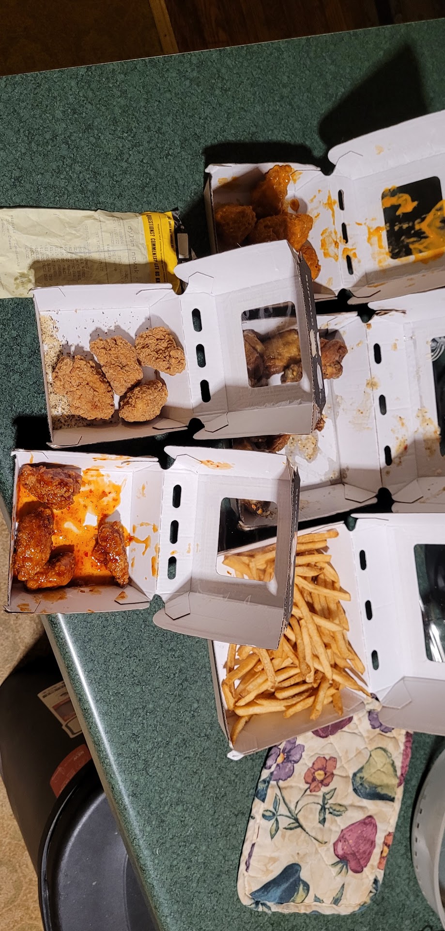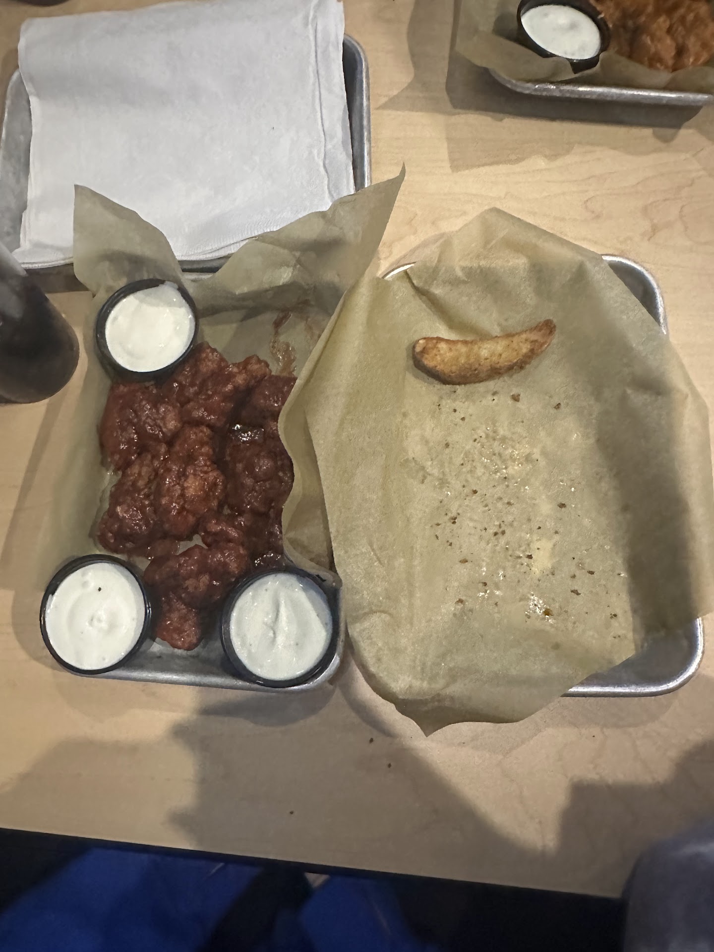 When receiving a refill while waiting for our food, our server didn't remove any of the cups or serving trays that were on our table. Evey item that was added to the table was not removed until we paid our bill at the end. My order was requested to have only drums and no flats. When I received my order, it was a regular order mixture of both.