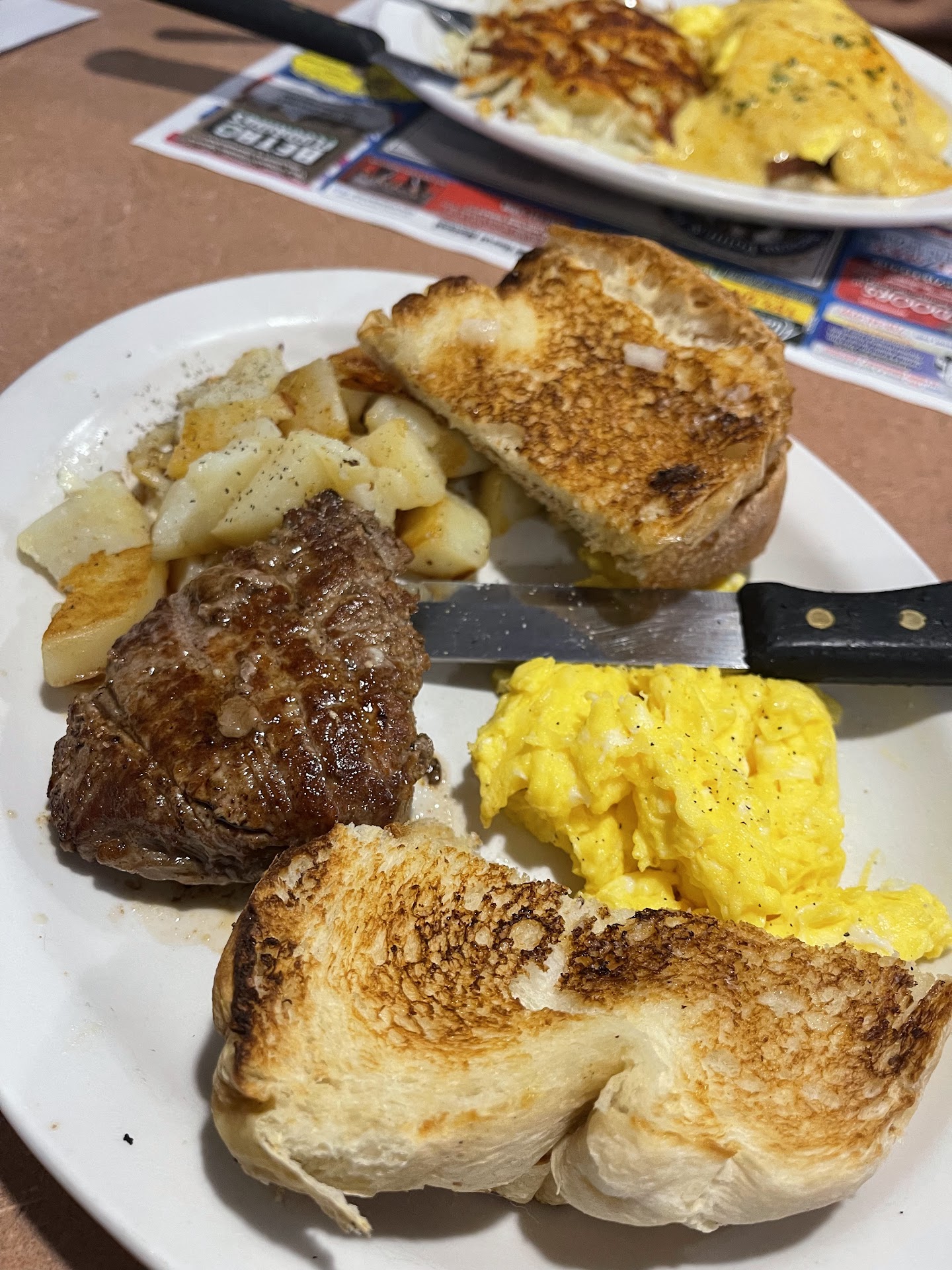 Medium Well Steak Breakfast Steak was cooked to the point where it was very dry. Our waiter did not come by to fill up our water, so I was struggling to eat the dry steak. I chose "fries" on the side, but it looked & tasted like cut up pieces of boiled potatoes that ended up getting fried on a pan.. I got a side of home made white bread. It was delicious, and fluffy. Eggs were ok.
