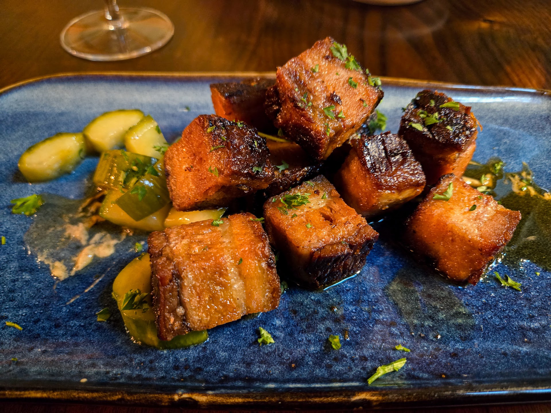 We ordered the Braided Pork Belly to share as an appetizer. This came with kimchi pickles on the side, which was a nice touch of vinegar to contradict the sweet, fatty flavor of the pork belly. The pork belly was braised in a honey bourbon soy glaze that was crispy and caramelized on the outside, yet the pork was juicy and fluffy on the inside. This was hands down our favorite part of our meal!