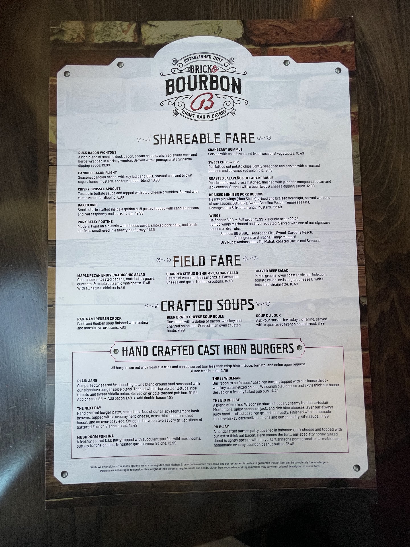 Read moreFor those not interested in reading my long winded reviews: In my opinion, Brick & Bourbon has taken very generous liberties with the descriptions of some of their menu items. So, buyer beware. Be prepared to pay a premium for something fairly basic that may not meet your expectations. And be prepared to pay a surcharge if paying by credit card, as some other businesses have started to do as well. Perhaps I will adjust the rating if the menu descriptions change to more accurately reflect the menu items served.