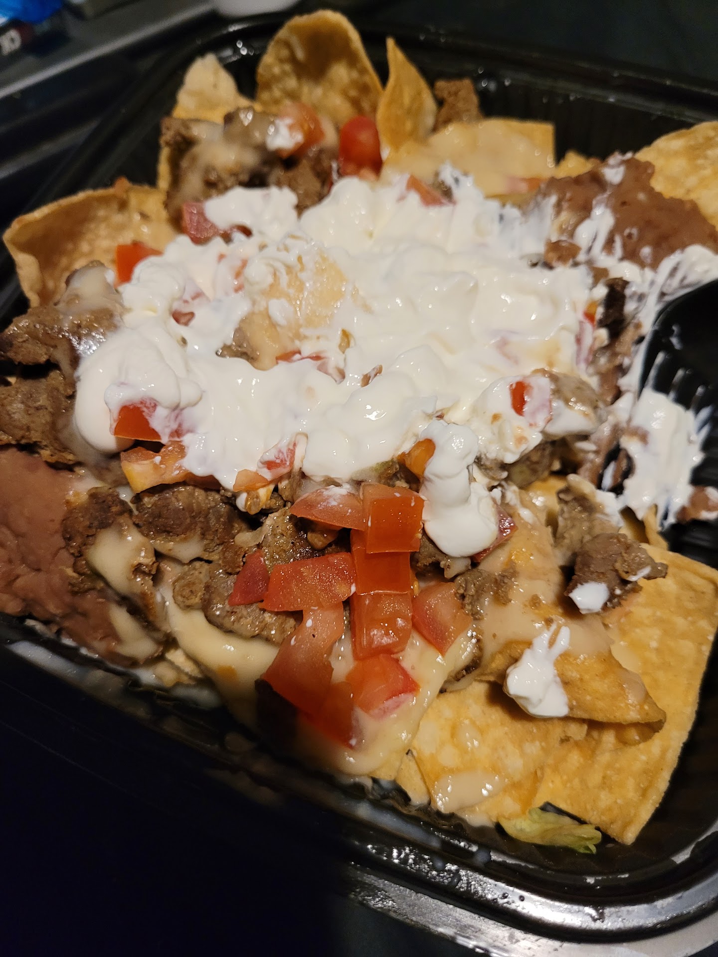 We definitely stick to coming here late nights, the food is always made better for some reason.... It's OK during the day, but sometimes the beans are burnt or something is skimped on.... but around midnight? Yep, we avoid the Taco Bell drive thru from Hell, and come here. I am actually surprised more people don't? We just ordered some nachos (without the jalapeños, those things are hotter than the ones I am used to, seriously, if you are more of a medium spicy type of person that is usually ok with jalapeños, order these on the side and try them first. If you like to bring the heat, then go ahead and go for it!) the night before last we randomly hit their drive thru, and this is what my "Steak Queso Loaded Nachos" looked like when we got home and I opened them.... needless to say, we loved our food and hope this place stays open! There is no one else to complete with Taco Bell and their add water/heat and eat food! (Not slander, I've worked for the company before, ask anyone that works at one, if they are honest they will tell you!) .... We (our household) needs Del Taco for late nights at least! During the day we can at least hit up Taco Bueno, still better than Taco Bell, but the Bueno here in town is unfortunately a roulette on quality, sometimes its good, sometimes its not. I am used to the ones in Tulsa that have more stability in quality and quantity...