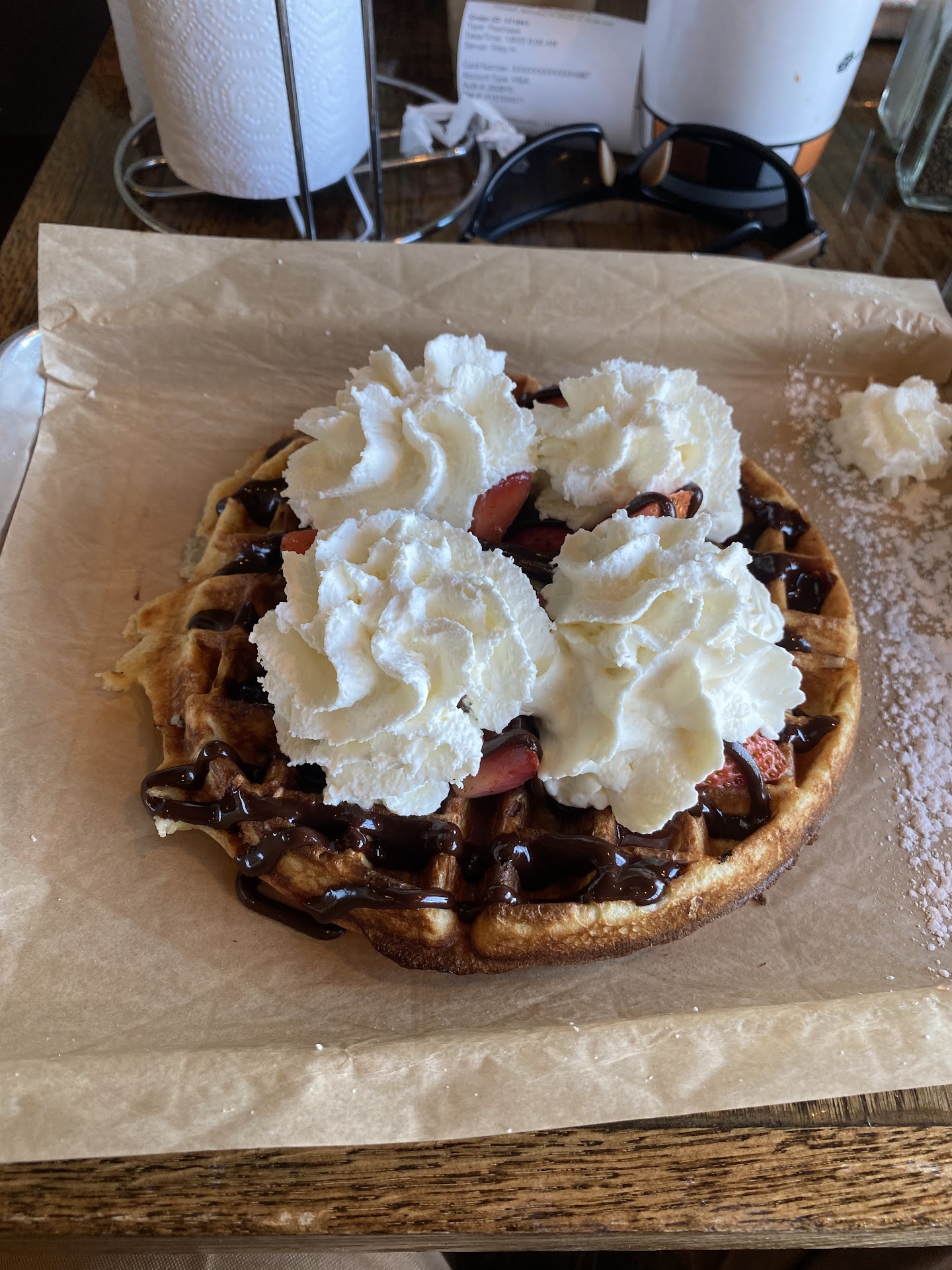 My recent visit was a flavor explosion from the first golden-brown bite. I and my wife dove headfirst into the delightful dilemma of choice. The blueberry/strawberry waffle was a classic done right – fluffy, buttery perfection studded with juicy berries. But the real star was our custom creation: a masterpiece featuring swirls of Nutella, melty chocolate chips, fresh banana slices, and a scattering of berries. Each bite was a symphony of textures and tastes – the sweet tang of berries, the rich creaminess of Nutella, the satisfying crunch of chocolate chips, and the soft, pillowy embrace of the waffle itself. The atmosphere is pure laid-back charm, perfect for a casual weekend brunch. The staff is friendly and helpful, guiding indecisive waffle-lovers through the extensive menu of toppings and syrups.