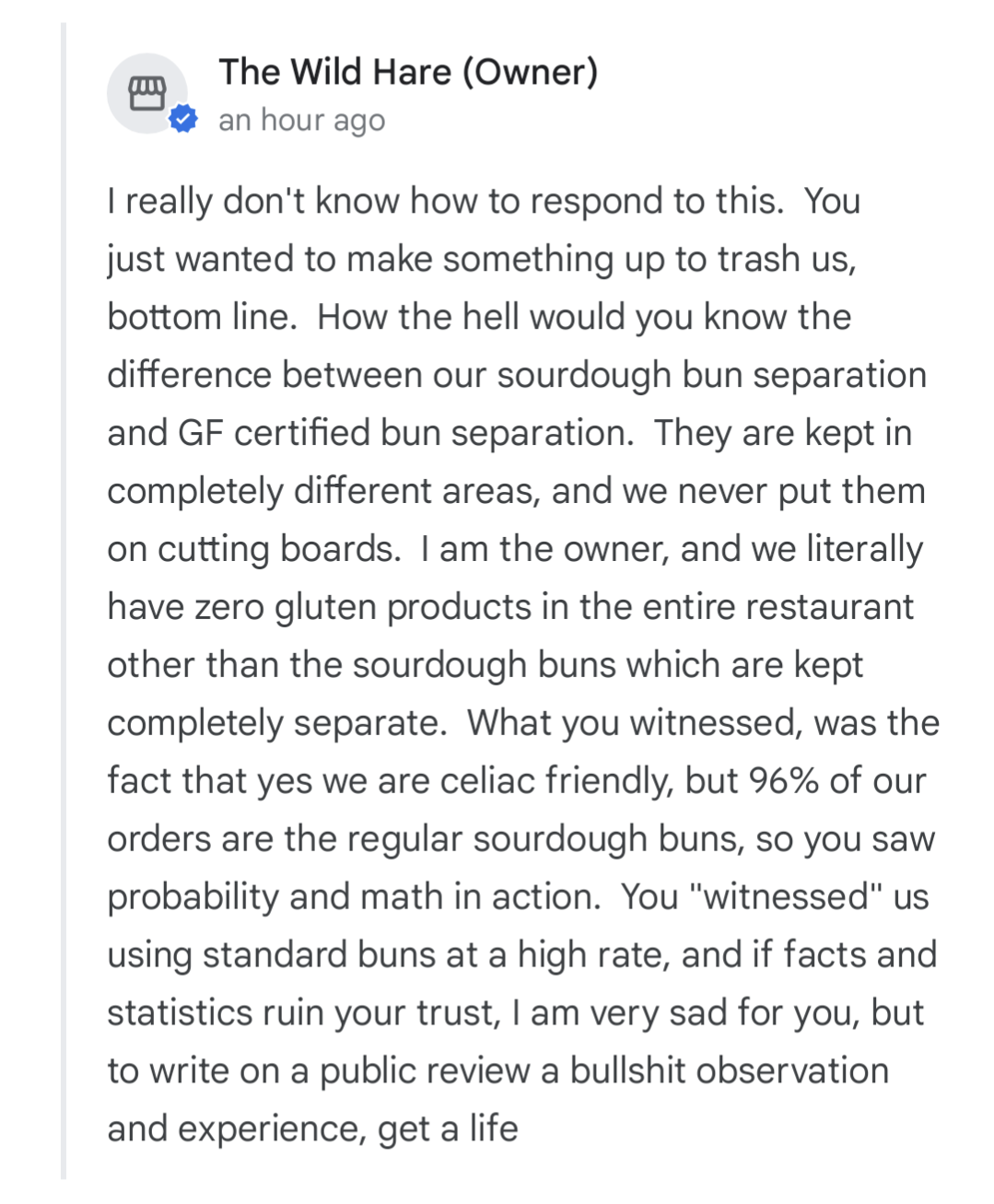 She was much more cordial in that personal response than she was in her reply here on google. I basically reiterated everything I said here. Also, I'd like to point out I am a level 7 google guide who specializes in GF eating, with no reason to just randomly pick a place to trash talk as the owner stated in her Google reply.