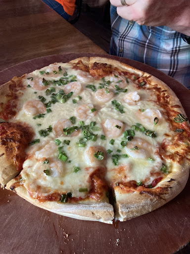 We got a shrimp pizza that was tasty. The crust was good and crispy on the edges. The sauce slightly piquant. The shrimp were the smaller salad size. Also, even though Katie warned us it might take 45 minutes, it was out in a lot less time.