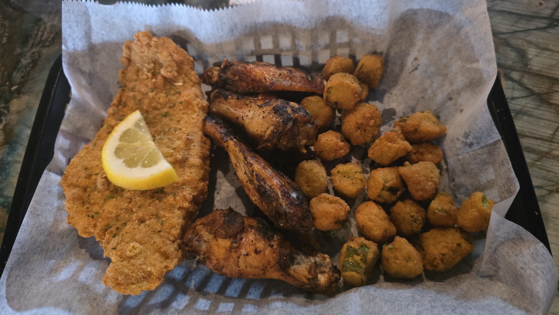 These smoke jerk wings looked perfect, but my friends said they didn't taste smoked and were a little bland (the owner says this is their #1 item, though). Now, I will say my friends also did not use the smoked jerk sauce that came with it because they wanted to taste the smoked wing alone.