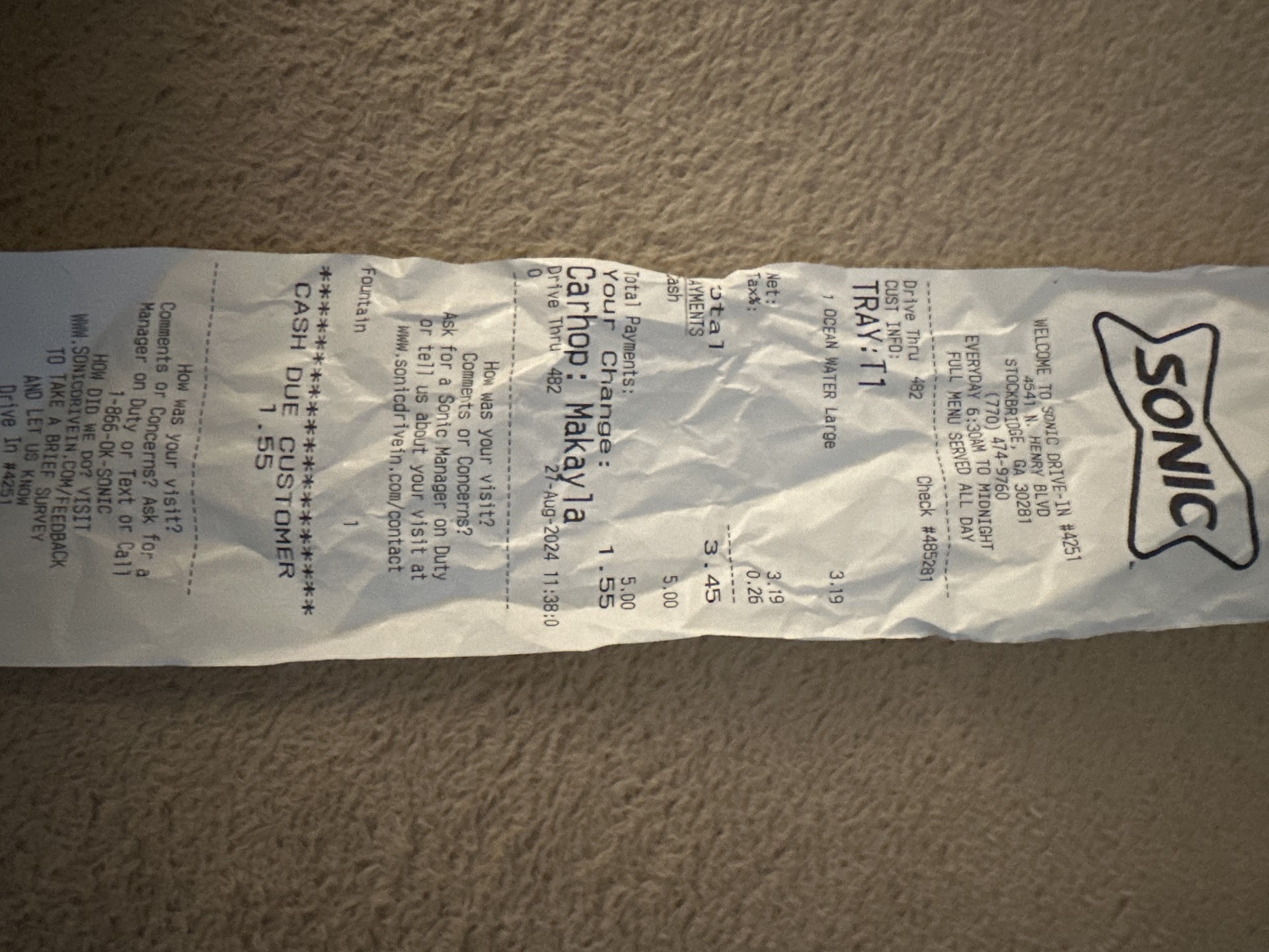 Read moreWithout thinking last night my husband and I got up and went out to Sonic to get something to eat when we got there they were open, but they were getting ready to close and we hadn't realized the time. There wasn't many people there so we took our time ordering and reading the menu. So at 11:00 the young man comes out comes to our door and tells us that they're closing and that they shut the girl down he believes but we can order a certain things and we said okay that's fine thank you very much. He walked away and then he came right back out and told us never mind even though the grill was shut down it was still hot and it wasn't completely shut down so we could still order. Not only did they get our order right completely. Everything on one of them was beyond fantastic and nice and apologetic that they it was their fault they didn't turn the lights out and they didn't have a problem cooking for us And anything that could get It's just refreshing to see because you don't see that anymore. Especially from a group of young adults. Our food is out in no time it was hot it was fresh it was perfect and I just appreciate them so much they didn't have to do that we wouldn't have expected them to open anything back up I cannot take them enough. I hope they get to see this message. Thanks again you guys, yall...