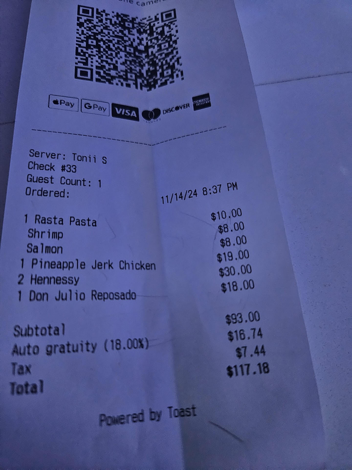 Read moreThis was my 3rd visit to this place because I wanted to be sure. My first experience was so pleasant and amazing that I decided to bring my girlfriends out to enjoy the atmosphere. My second time I would give a 5 because we waited 1 hour to even get a waitress which was rather a very slow night so we just had drinks and left. Now this time I am certain I won't be returning. First off the manager was extremely nice as she greeted us with bottled water (Thursday night). We sat at the bar where Ms. TONI was our waitress/bartender. Me coming from a waitressing background myself i always try to be super polite. Since this was my first time ordering food I asked what was her favorite dish she said the Rasta Pasta. I ordered that with salmon and shrimp. She took my order ran off so quickly that she forgot to take my husband's order. I kept trying to get her attention and though not busy she ignored me, it wasn't until the manager told her that hey the young lady needs you that she decided to help even 10 mins later then. I told hey you forgot to take his order she acted as if she mistakenly ignored me and apologized. Of by this time my food came out first and we didn't eat together. My food was flavorless and tasted of pure salt with parmesan. The salmon was cooked to perfection but lacked flavor but very salty. My husband ordered the Jerk pineapple bowl and the chicken taste spoiled like it was sitting out all day. We just paid for our food after we were able to get her attention after she avoided us for an hour. Our drinks were over priced and food was terrible and bartender was attentive and nice nasty. I won't be returning. We spent over 100.00 dollars for subpar service, terrible food, bad service, and woke up with bad tummy aches. I hate this for our black businesses because I really be wanting...