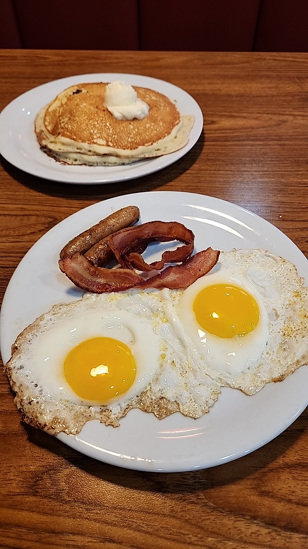 The quality of the food was hit-or-miss. I ordered the Grand Slam breakfast, which included pancakes, eggs, bacon, and sausage. The pancakes were decent, but the eggs were overcooked and lacked seasoning. The bacon was overly greasy, and the sausage was somewhat bland. My companion ordered a burger, which was underwhelming in both taste and presentation, with the bun being slightly stale.