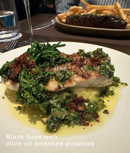 My husband had the burrata appetizer, and I had the baby iceberg wedge salad. Chelsea recommended this salad saying that the dressing was to die for. She was right! BEST blue cheese dressing ever. The whole salad was perfection, thick little pieces of bacon, Point Reyes blue cheese crumbles. I am a salad geek and love a good salad. This was astoundingly good. Husband loved his burrata with greens as well. He ordered the MoāBetter mocktail which was not only beautiful, but so tasty! My martini was also perfect. Our entrees were just as brilliant as everything else up to this point. I ordered the black bass with olive oil crushed potatoes, olives and salas verde. Husband ordered the steak frites. Both dishes were perfection. My bass was delicate and moist and the olive oil potatoes and green olives made it truly scrumptious. Husband said his steak was also just perfect. Cooked to perfection with a lovely bone marrow bordelaise.