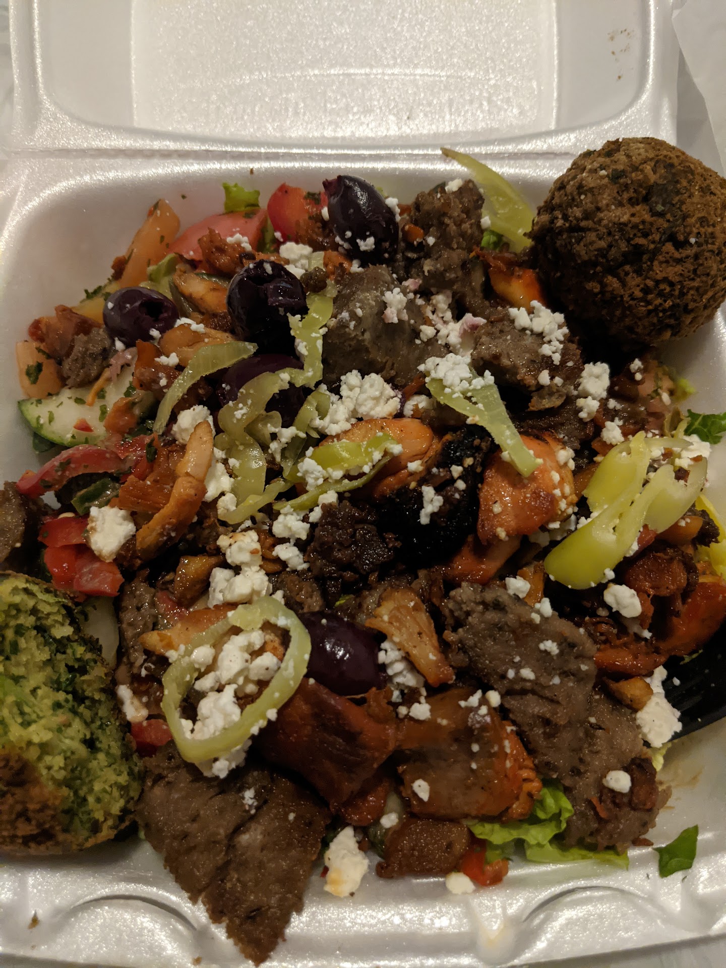 I got a Showarma, Falafel, and a massive greek salad with falafel, gyro, chicken, and a dolma on top.