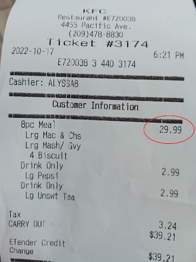 Read moreKFC is DEAD! Why is it that nearly every review you read about KFC is horrible? Well that's because it is... Good luck not receiving any thing BUT finger licking good food! And when your orders not right or you have a problem be prepared to be treated like your a liar or some sort of customer/thief trying to get a free side or piece of chicken.... Then, only to find out when you can't believe the way your treated at your local KFC you complain at the corporate level and find out they too will not make it right, well unless them telling you their sorry you had a bad experience at one of their locations is enough for you.... I don't need a free side or my money back, I would just like to know that at least the management was treated as poorly/ harshly by the owner or corporate as I was at the store level that would be...