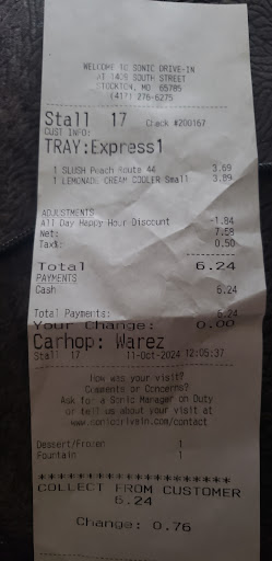 Read moreGiven how many times we have been to sonic, you would think that at least 2 out of 5 times you would have a good experience. This is not the case in stockton. 4 out of 5 we normally get something wrong with our order. My latest experience was the last though. I pulled up with my list of food, pushed the button, and waited for my turn. Noticing that they were very busy, i figured it would be a bit.......i waited soo long that the push button had timed out! I had to push it again. It was at this time that another customer pulled in beside me and pushed her button after a bit. To my amazement, after a few minutes, they took her order!!!i had waited twenty minutes... What's up with that!! Shortly after taking her order they came on the speaker to take my order.. To say i was nice would be a lie...i have had enough..i don't want to call everytime i get home to feed my family,after spending soo much money to eat out ,just to find out the order is wrong.AND i don't want to wait for twenty minutes to order than wait another twenty minutes to get my food!!!i got to sonic at 8:09,i called my wife to tell her what happened and why i was going to be late, after placing out order at 8:28.i received my food and pulled out at 8:45.. Sorry sonic, you don't...