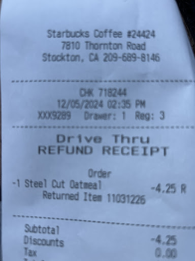 OFFICIAL POST! WARNING SCAMMING CUSTOMERS! ALL reviews are fake as you can see the worst ones are displayed first because they carry the most truth and relevance. I came in on Thursday December 5th at approx 235 pm, ordered oatmeal, get to the window and they failed to tell me that they were out of the key Ingredients that you add to the oatmeal, brown sugar, nuts, and Dried fruit. So they charged me, cognitively knowing that they were cutting me short, this is proven by the Pre-packed bag and in a sneaky fashion, not tell me about it, this probably happens to dozens of people per week. If you cannot complete an item in its entirety, then you should not promote it on your menu anymore or at least tell people. I will be calling the corporate office and reporting that this location and the one down the street on Lincoln that they advertise the sale of items that are incomplete now I have to wait because of their malpractice, 2 to 3 business days for the funds to return, which is also inconvenience, not per se to myself, but to the low income community, in which Stockton statistically falls into that category. This would mean greedy, corporate companies like this one are stealing from the poor. I am also going to write about this to the Better Business Bureau because managers here should be smart enough to tell their employees what they should and should not be doing in the store. There is no excuse! I went into the other location at the LincolnCenter And I had to ask if they had all the components to the oatmeal, but he was about to charge me as well and they told me they had absolutely nothing. They have no respect or decency to their customers. Also, how do you run out of things by 2 PM and all your stores out here on a Thursday. Obviously, they are not doing...