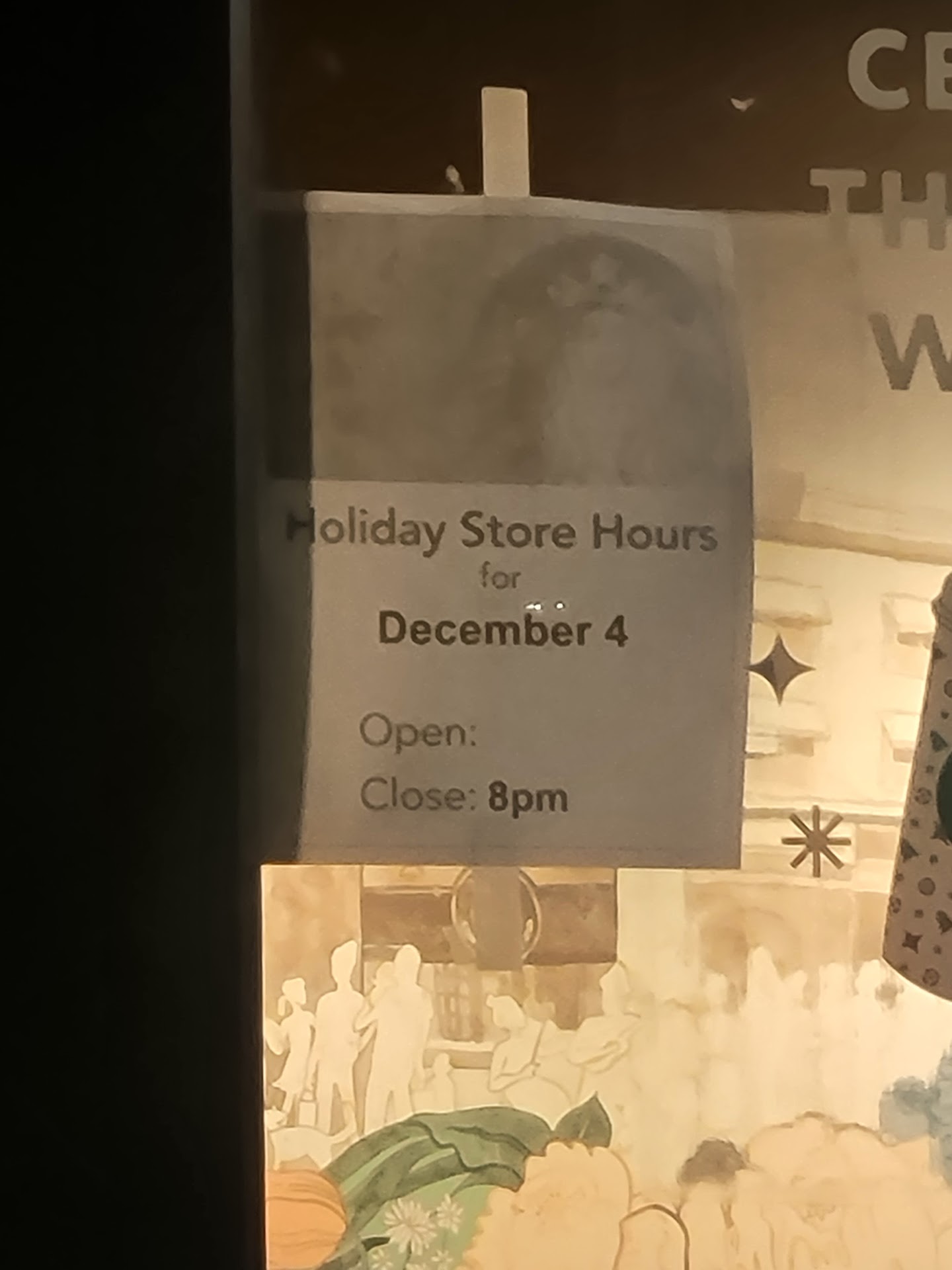 Not sure why they closed early (short staffing, etc.). I know it mentioned "holiday hours" but I looked up today and the only holiday I can find is National Dice Day for 12/4/22, nothing of any importance to any major faith including ones I know I'm not super familiar w/dates on like for Jewish & Muslim holidays, etc.