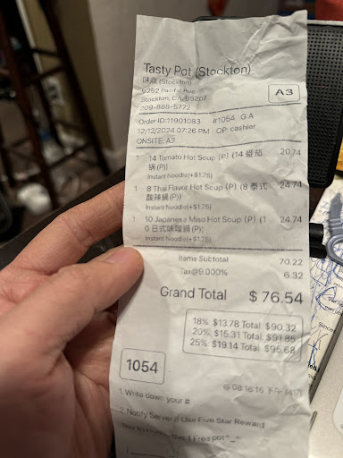 Read moreI guess the food was OK. I really have nothing to compare it to. This type of food is out of my league. Everybody in there was of the Asian persuasion except for me. Everybody else was eating with chopsticks and I was using a fork and a spoon! That being said, they were very busy. The three cheesy milk hot soup that I ordered was loaded with goodies. It was so hot I had to put ice cubes in it to be able to eat it. To top that off they have a can of sterno underneath it to keep it hot. Imho, they definitely do not need a heat source for this soup. A normal human cannot eat it directly because it is so hot. I also had a side of sliced lamb that was tasty. In the end, I really didn’t need it because of the quantity of items in the soup. The negative…the sterno burning under the soup stunk with a chemical smell. So much so I asked the server to extinguish the flame. Which she did. And that helped. The other thing, the chemical they use to wipe the tables off stinks terribly. Real strong chemical odor. It’s quite offputting when you’re eating. I won’t go back but I don’t want to discourage anybody from trying it. The soup is definitely quite a meal. If you grew up on this kind of food, I’m sure you would appreciate it. They were very busy tonight. The price is not cheap but the soup is loaded. It has some kind of tiny eggs in it maybe quail eggs? The soup was $17.50 and the sliced lamb was seven dollars. This is a great addition to the Stockton...