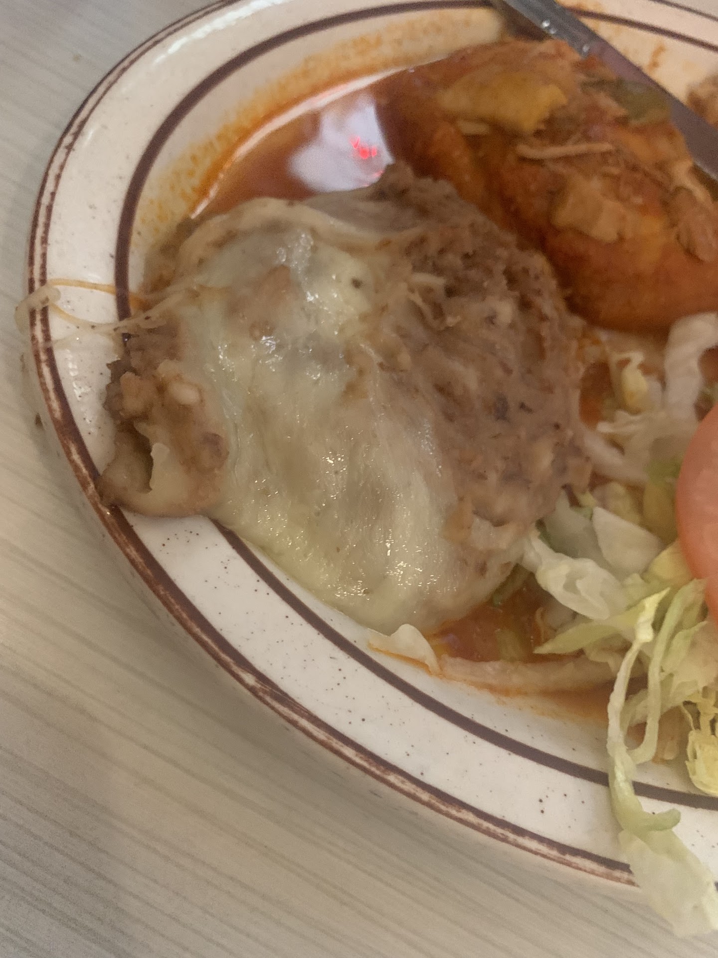 On the service side I can see where some people would be really pleased to get their food in less than 5 minutes, but, I'm of the opinion that it's ok to wait and get food that's treated less like it's being tossed on a plate on a production line or buffet and more like it's being made with a little more love and care, but perhaps that's not their way anymore. As such, the food tasted mass produced, bland and unfortunately tonight, an entire half of a wishbone was in the chicken enchiladas..... not the first time. Worse yet, it didn't really phase them when we brought it to their attention. It's possible that because we're regulars they just kind of figured we wouldn't mind. Having spent 25 years in the restaurant business I could be very forgiving of an occasional accident when handled appropriately, but it wasn't. And considering I almost choked on this "accident" , I don't believe that the equivalent of an "oh well" is appropriate under any circumstance.