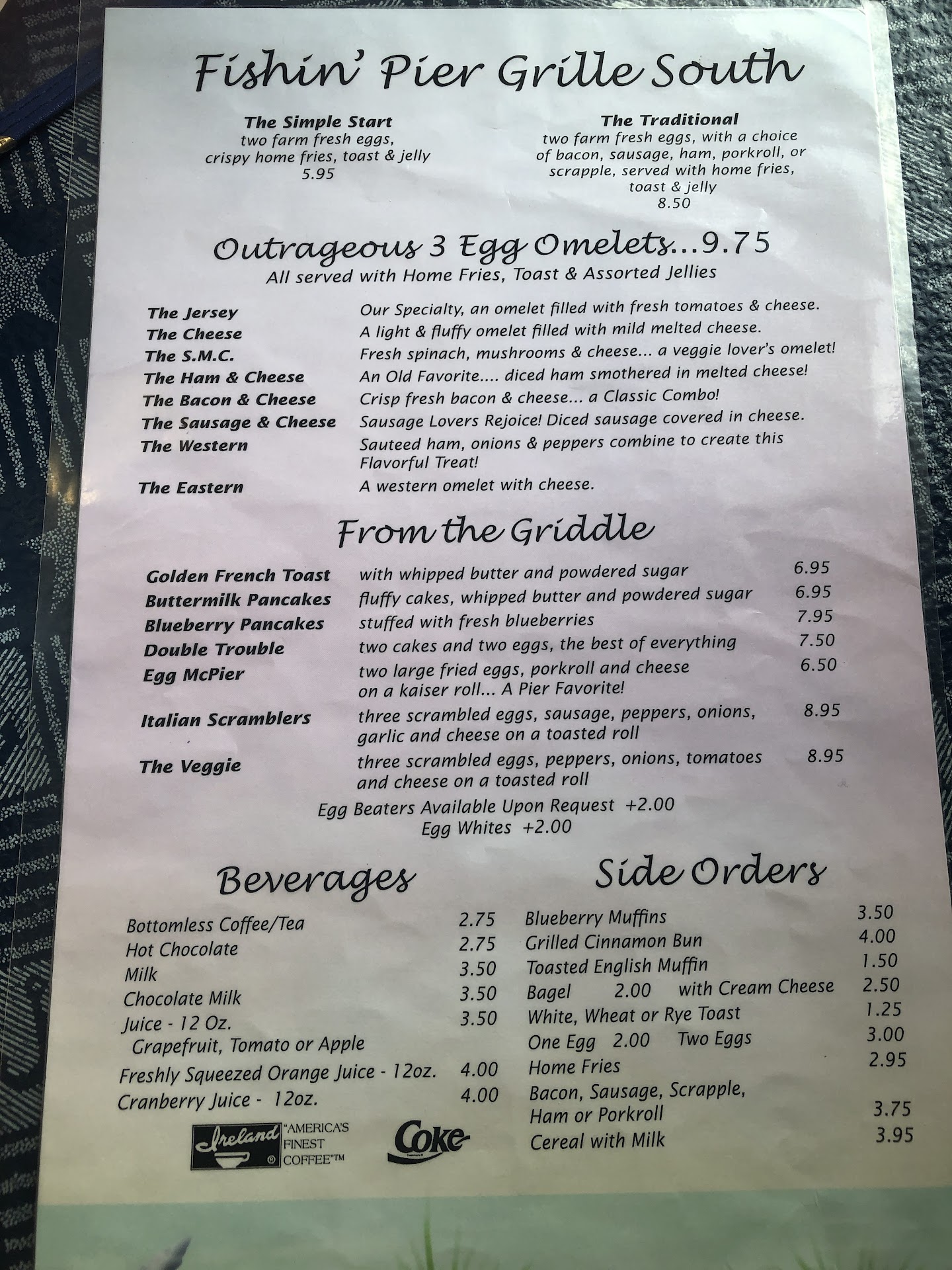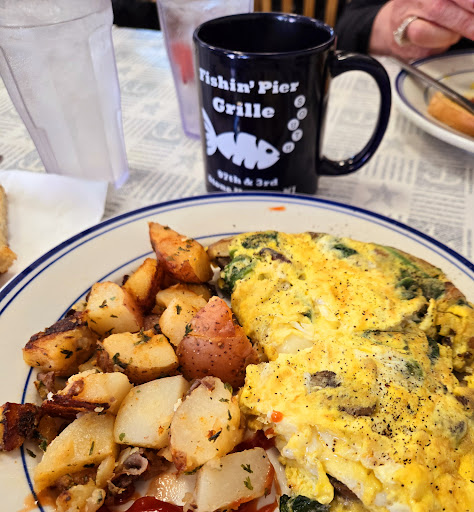Ā Ā Ā Read moreWith an unusual hankering for breakfast my wife and I found ourselves seated at Fishin' Pier Grille South. Drawn to it's small diner atmosphere, we were seated promptly and had hot coffees in front of us quickly. From simple breakfast options to more 'complicated' omelettes, there is something for everyone on the menu. We ordered the Double Trouble (with blueberry pancakes), the raspberry french toast with a side of bacon, and a cinnamon roll to share. For as busy as they were, our food came out quickly and was piping hot! The pancakes were loaded with blueberries, the french toast had a subtle, yet delicious, raspberry flavor, and the cinnamon roll's icing was the cherry on top of everything. The next time I'm in the mood for breakfast in Stone Harbor, I'll be making a return...