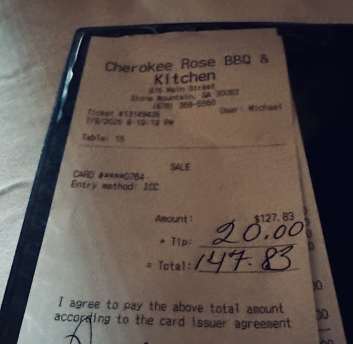 Read moreOur dinner plans tonight were going to take us to 1910, but we found a 45 - 60 minute wait when we arrived and decided to try Cherokee Rose in Stone Mountain, which is an honest to goodness hidden gem. You have read our reviews and know that we have been to some fantastic restaurants, but this was hands down the BEST dining experience we have ever had! Our server Venicia came to the table to greet us and set the mood for the evening. She was very personable, played off all the personalities at the table very well, and made everyone laugh. But the food was the star of the evening! (Sorry Venicia). We started with the calamari and the crawfish cakes, and either could have been a main course on itâs own! The texture on the outside of the crawfish cake was so much like youâre having a doughnut, and the inside was sultry with a little bit of spice. The entrees were the herb crusted ribeye, pork ribs, lamb chops, and fried smoked chicken. The ribeye came with dill whipped mashed potatoes and collard greens with smoked ham hock, and I was overwhelmed by the explosion of flavors! The ribeye was cooked to a perfect medium rare and had a delicious, beefy flavor while the collard greens tasted like they had been simmering with that ham hock all day. The ribs were served with creamed corn and corkscrews and cheese (Mac n cheese), and if any one of the components were missing, the meal would have been just good at best. The ribs were tender, real depth of flavor; a little bit of sweet, a little bit of tang, and the creamed corn caught everyone at the table by surprise by how the flavor just filled our mouths. The fried chicken was an incredible display of culinary firepower! Dear Websterâs, we have a new picture to go with the word delicious and juicy. This chicken was very juicy, very flavorful, and we could tell that a lot of work is involved in the preparation. Lastly, the lamb chops and Cremini mushrooms. I have to believe that this lamb did not follow Mary much because of how tender it was! The flavor was light, but lingered on the tongue long after you swallowed. To top off the meal we enjoyed dessert....Pecan Pie, Chocolate Pot De Creme, Cranberry Rum Bread Pudding, and Cheesecake. When I took my fork and cut into each, I felt like my fork was making love to the dessert. The pecan pie was rich in flavor without being overly sweet, the pot de creme was smooth and velvety on the tongue, each bite of the bread pudding was a new adventure, and the cheesecake was sultry with a little bit of sweet. Overall, the meal was not good, it was not great, it was outstanding! So much so that we are planning to go back tomorrow for brunch and sit in Veniciaâs section in hopes of an equally...