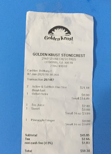 The taste of the food is consistent with GK but with a lot more grease. For the breakfast meals that consisted of ackee, 1 boiled banana, 1 fried dumpling and 2 pieces of plantain, I paid $11 each which is a pretty high markup considering the minimal contents.
