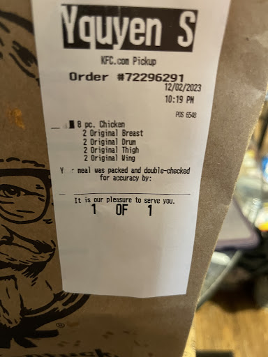 Ā Ā Ā Read moreI give them 1 star because there is no way to put -5. I placed an online order, we drove to the store to pick it up. Something tells me to examine my order. I notify the attendant that the chicken I ordered was original and this was crispy. She proceeds to tell me that they were short 2 pieces and she mixed the original with crispy. Due to some dental issues that come with age, I have no use for crispy or extra crispy chicken. I told her, this was not what I had ordered she insisted on giving me what she wanted as opposed to what I had ordered. Sad, why bother asking me what I want if you are going to give me what you want anyways. This is not a good business practice and the managers are failing in employee training and supervision. This is why Popeyes and Publix get more chicken sales than they do. She said there was a15 minute wait but did not offer me the option to wait. I would have waited for what I wanted and paid for. Once we got home we discovered that none of the chicken was original. There were some crispy pieces and some rock hard pieces. I expect to speak to the manager of this location on Monday or I will dispute this charge with my bank.