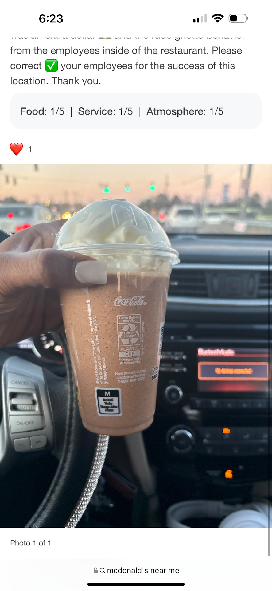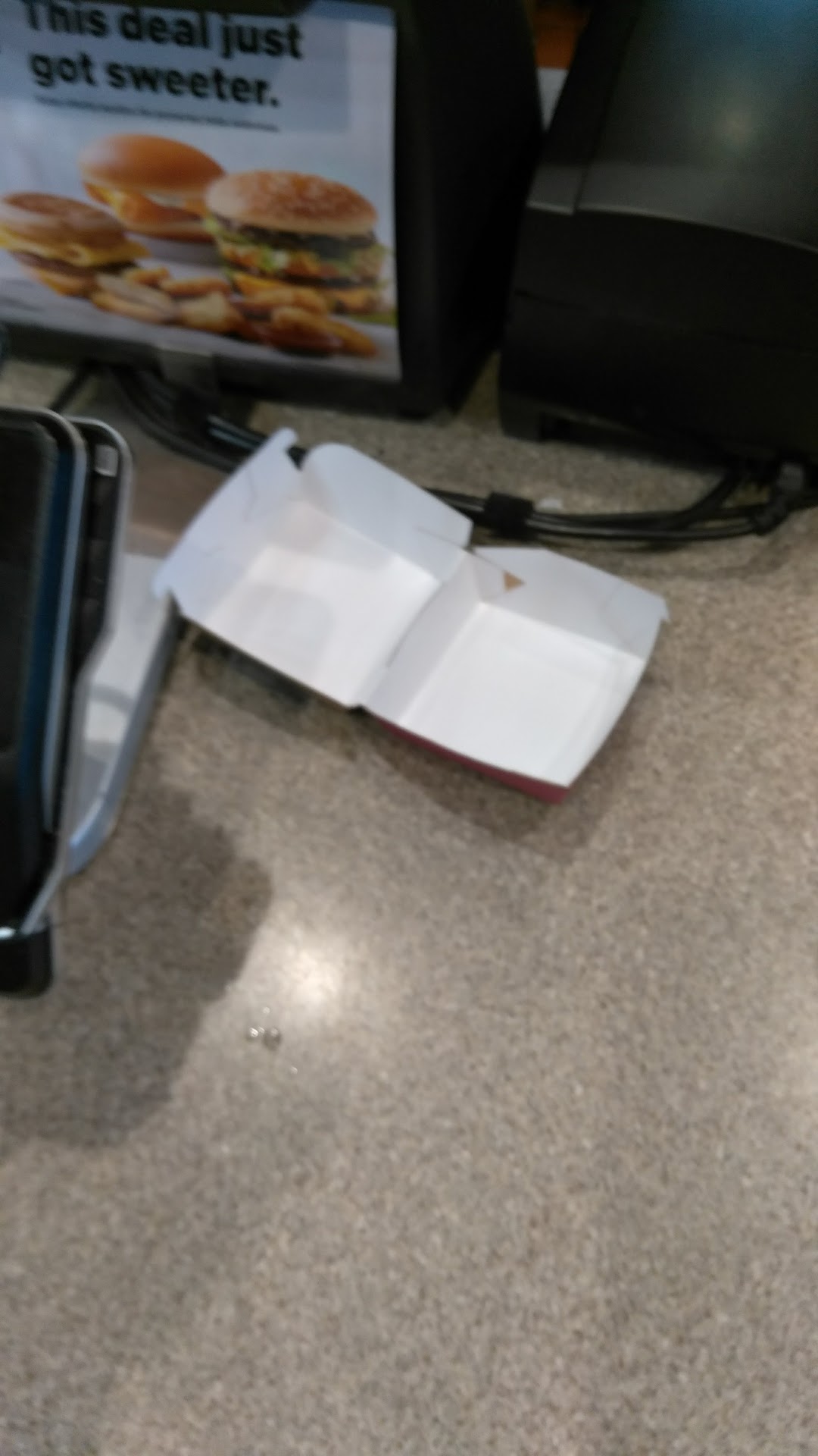 Read moreLucky you. In the evenings at the store closest to me, it happens probably 20-25% of the time. Mornings they rarely ever make a mistake. The parking lot is small and congested. Pulling out of drive through and then not going immediately on to the main road is virtually impossible. Pulling over on a major street to check my order is unsafe. I'd have to pull into another parking lot to do it. Then I have to go back and wait in some sort of a line, maybe not the ordering line, but if you go directly to the counter they ignore you for a few minutes. Then they will happily fix their mistake. But everything preceding that is a major inconvenience. A Big Mac/Quarter Pounder type combo is over $16. Having to go back costs me at least another 15 minutes by the time I'm made whole, and some people have places to be. I get mistakes are made, but at the prices they charge these days, they should happen far less often. We don't purposely mess up orders. Someone before or after you probably ordered a 6 piece, and in a rush or simply human error, the runner probably accidentally gave you the wrong one. You can easily remedy this by going back to the store and explain to them what happened. If you can't drive to the store right away, give them a call and they will give you your 20 piece the next time you stop by. It's...