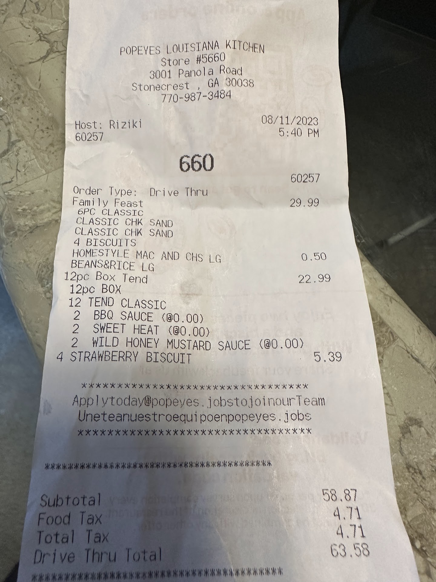 My husband & I are local entrepreneurs in the Dekalb County/City of Stonecrest area and we passed by several other Popeyes’ locations just to spend money in our neighborhood. To our dismay, we made the biggest mistake by patronizing this particular location on Panola Road.
